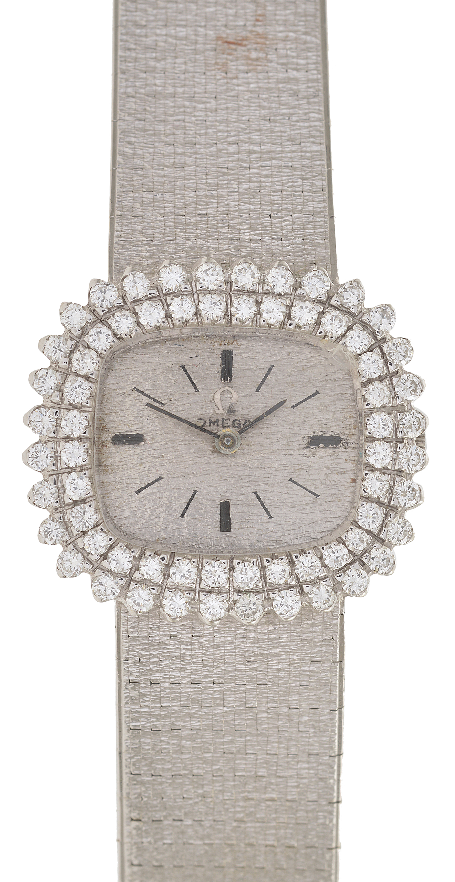 Manual wind movement, oval silvered dial with baton numerals, signed case, dial and movement, 18ct white gold case with double diamond set bezel and bracelet bands, total length 150mm, 15mm diameter.