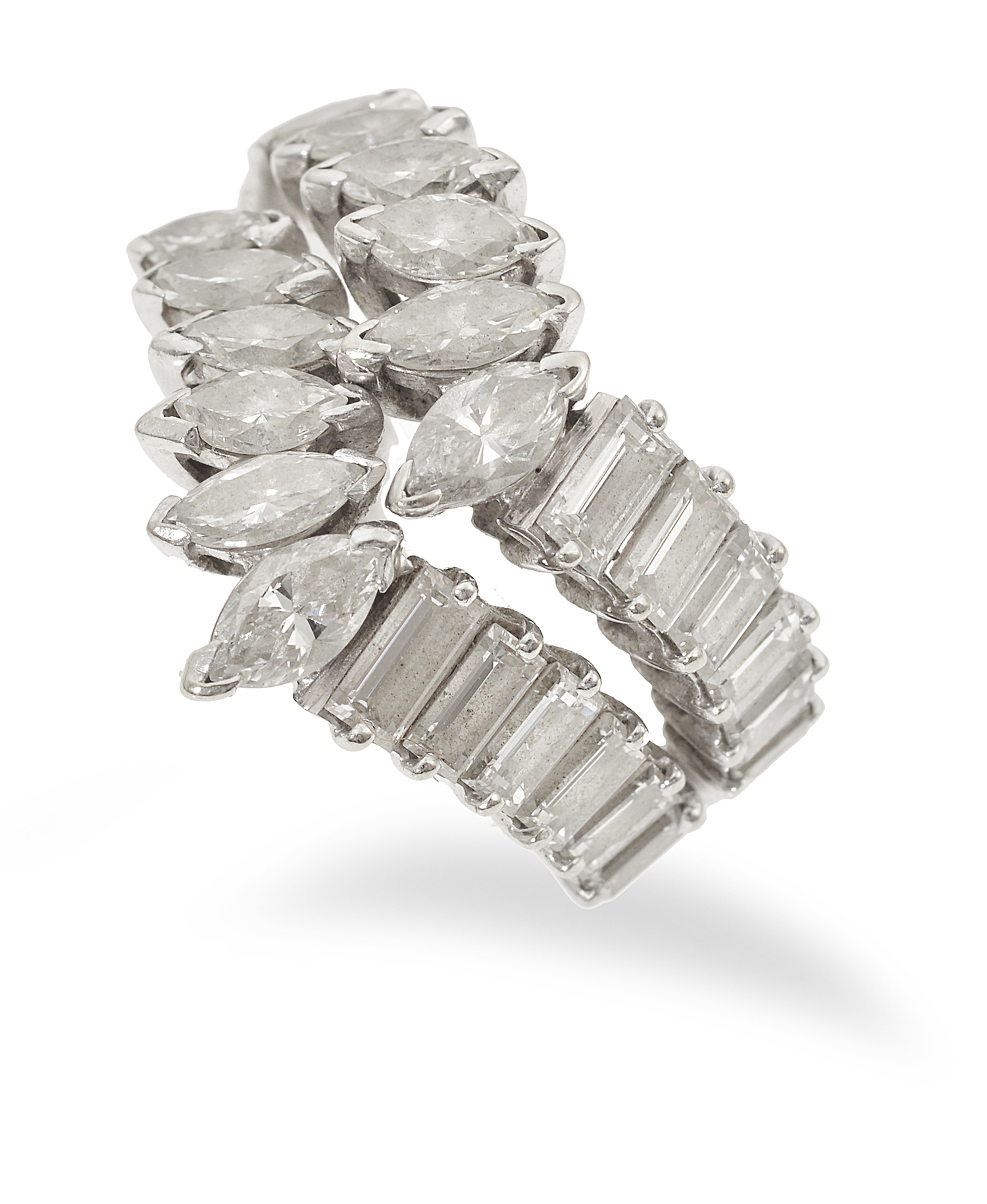 Ring presents in very good condition and stones are secure in their settings. Two rings have been soldered together. Diamonds are colour G-H, clarity VS-SI. Each band has six baguette and marquise cut diamonds totalling 1.84cts.
