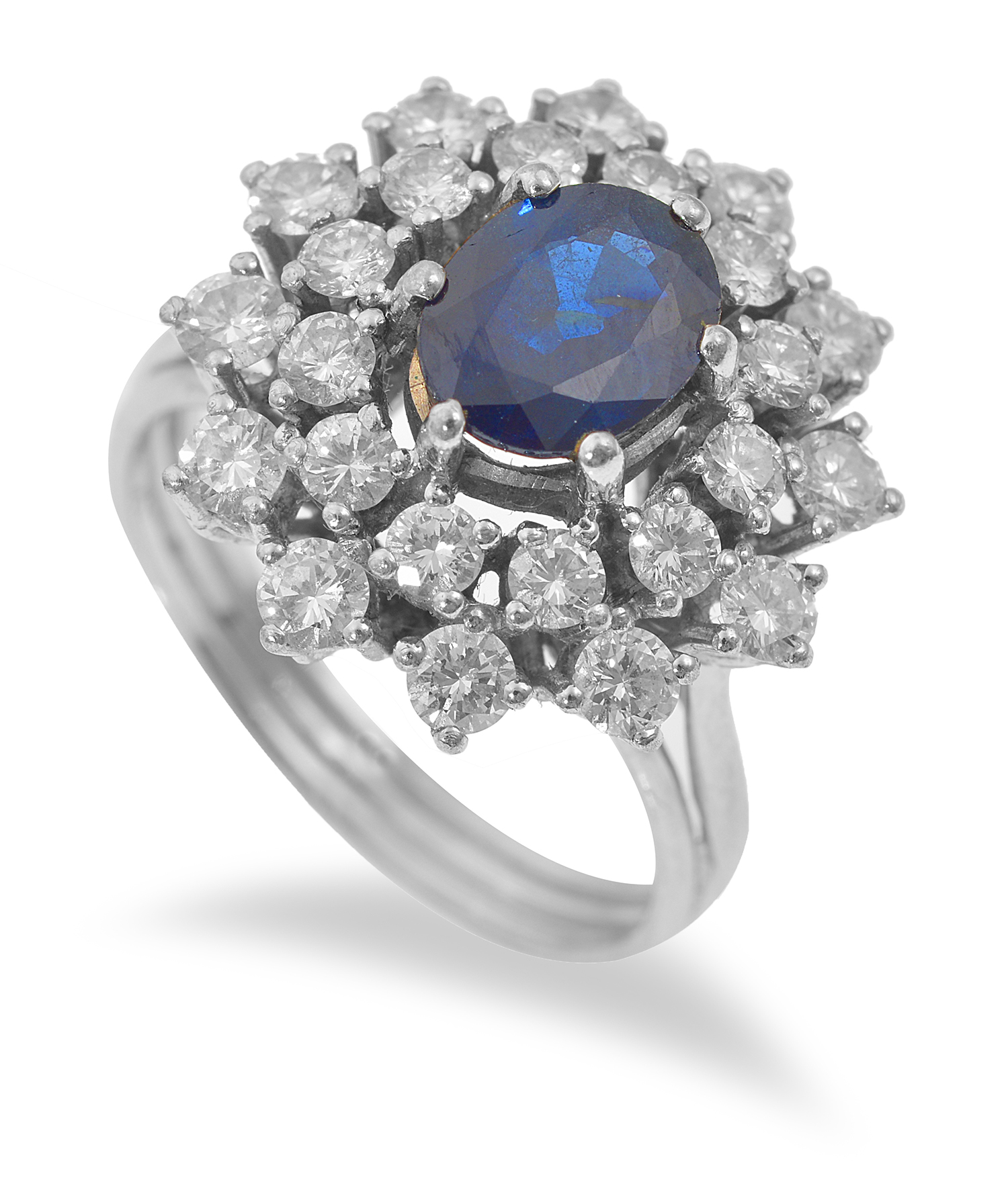 Featuring an oval cut sapphire of 1.40cts surrounded by a double row of round brilliant cut diamonds, mounted in 18ct white gold, ring size N.