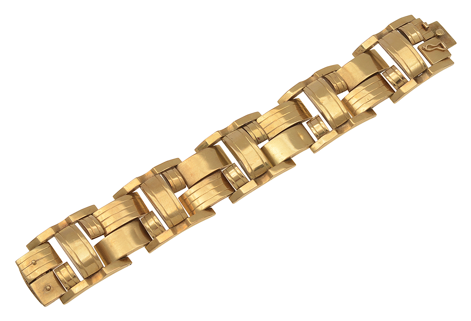 The fancy pierced geometric panels having etched and polished finish, in 14ct gold, total length 175mm.
