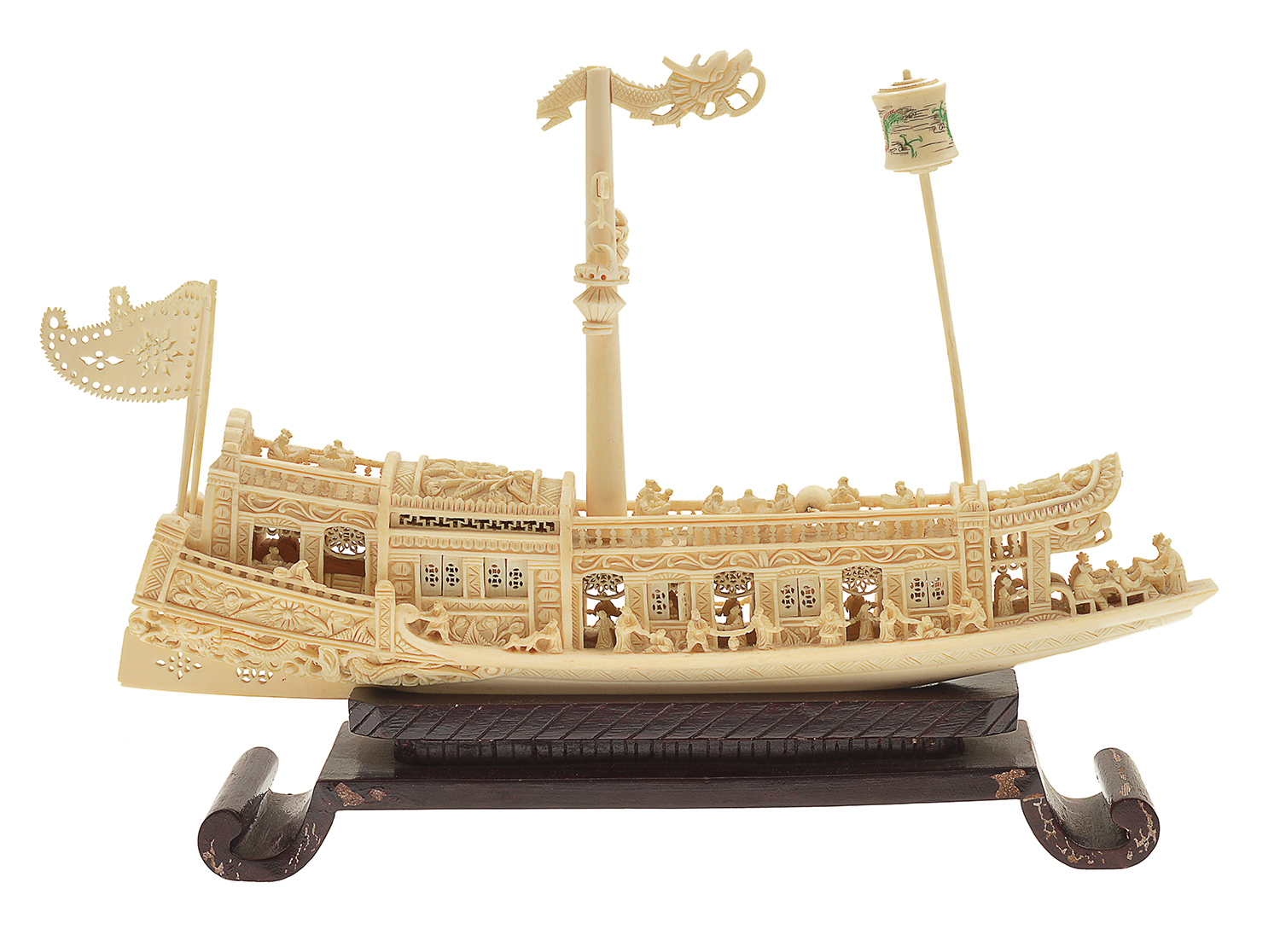 A CHINESE EXPORT CARVED IVORY MODEL OF A JUNK ON STAND