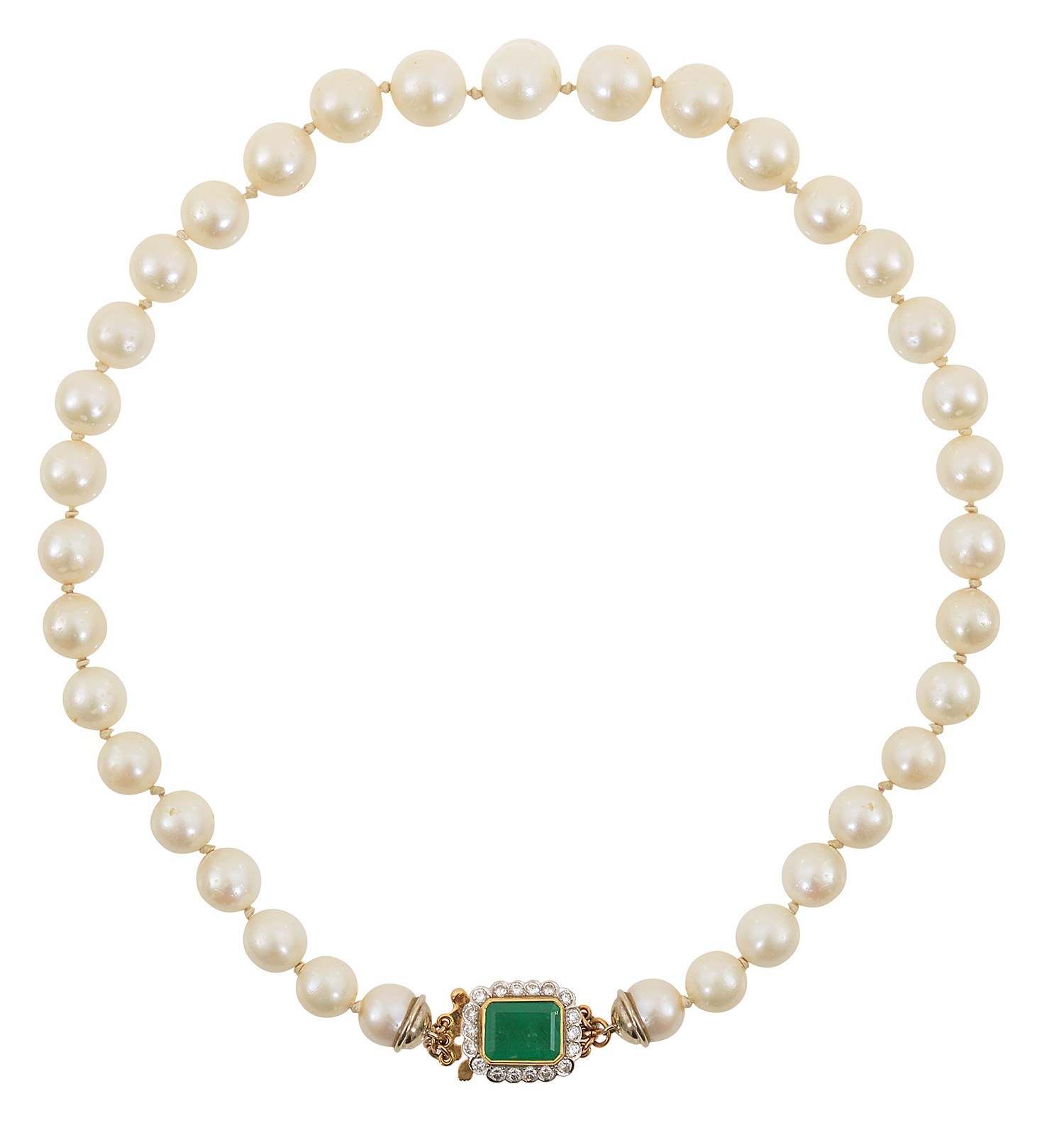 The round graduated pearls of cream hues measuring 11.10mm - 13.70mm, to a gold clasp set with an emerald cut emerald of 4.95cts surrounded by round brilliant cut diamonds, total length 550mm.