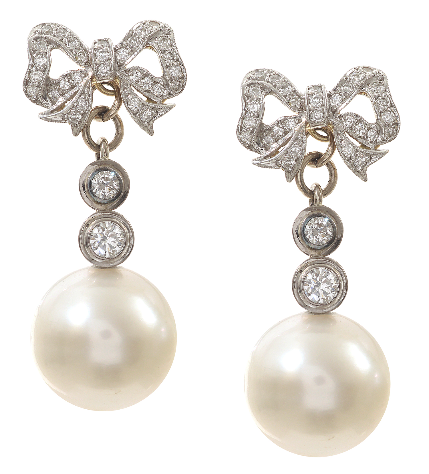 Each earring featuring a round pearl of silver and white hue measuring 16.0mm, surmounted by two round brilliant cut diamonds totalling 0.42cts and suspended from a detachable diamond set bow, mounted in 18ct gold.