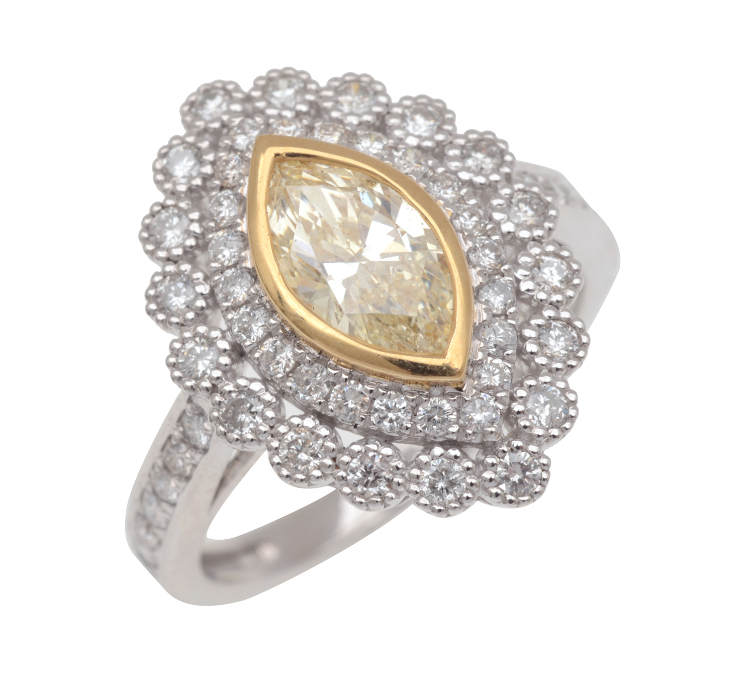 Featuring a marquise cut yellow diamond of 1.01cts, surrounded by a double row of round brilliant cut white diamonds totalling 0.72cts, mounted in 18ct white gold, ring size O.