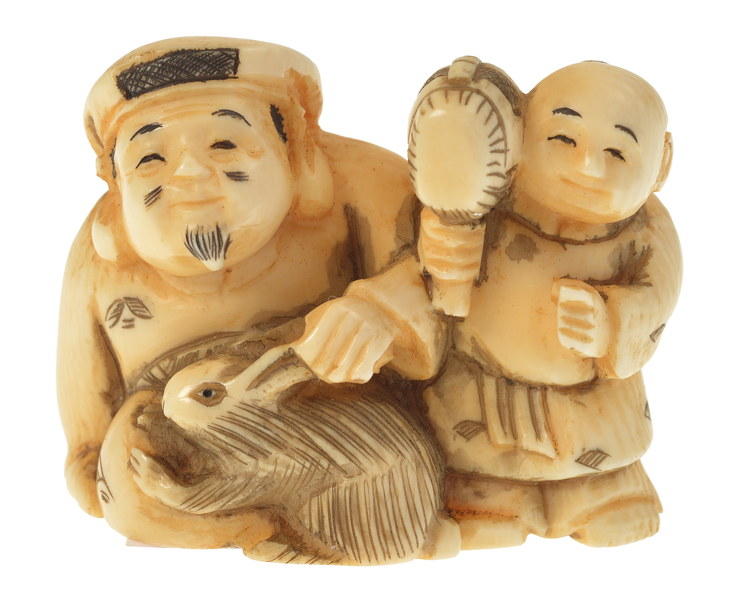 A 19TH CENTURY IVORY NETSUKE; TWO FIGURES AND RABBIT