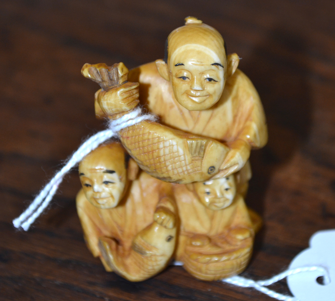AN IVORY NETSUKE; TWO MEN HOLDING FISH