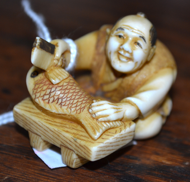 AN IVORY NETSUKE' MAN CHOPPING FISH