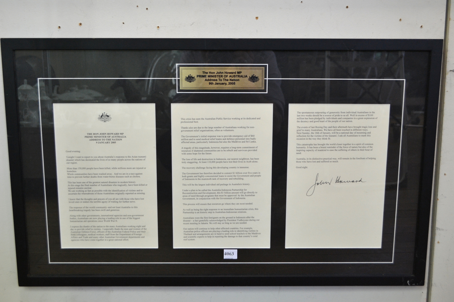 A FRAMED 'ADDRESS TO THE NATION', SIGNED BY PRIME MINISTER JOHN HOWARD