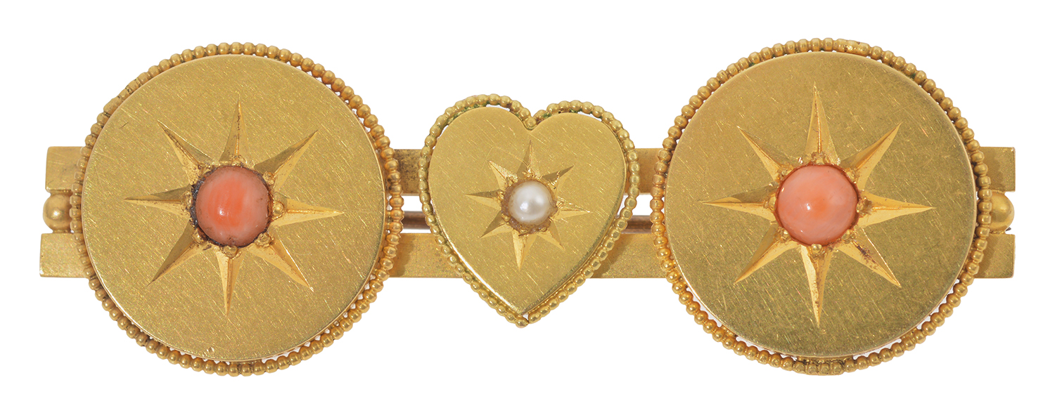 Comprising a heart and two circular panels set with coral and pearl, finished with bead work above a double bar, mounted in 18ct gold.