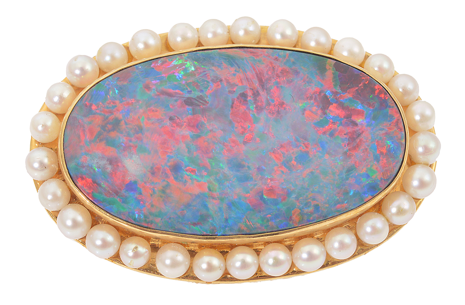 The oval opal surrounded by a row of seed pearls, mounted in 18ct gold.