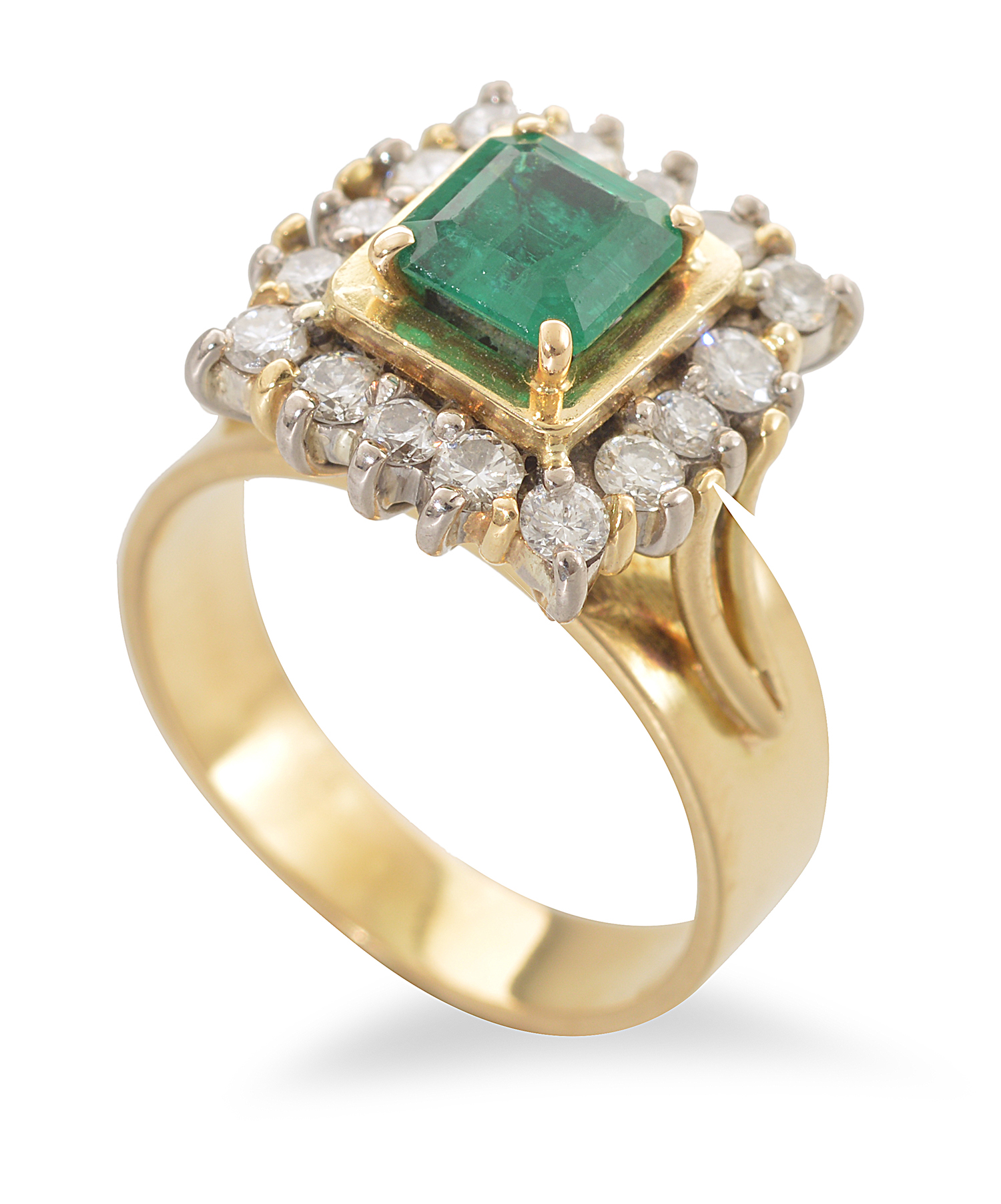 The emerald cut emerald of 1.10cts, surrounded by sixteen round brilliant cut diamonds totalling 0.88cts, mounted in 18ct gold, ring size R.