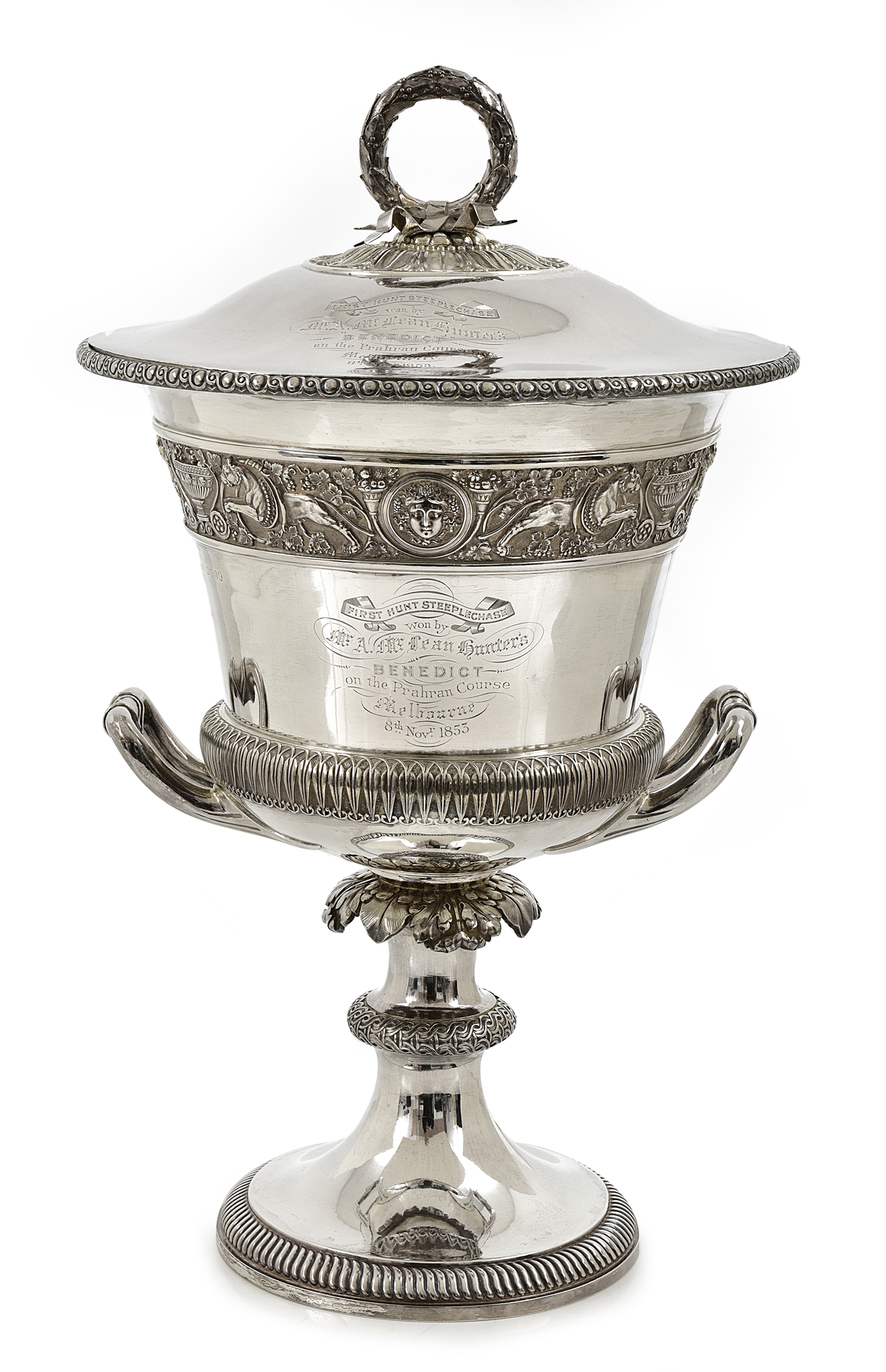 campana, the cover and body bearing the inscription 'FIRST HUNT STEEPLECHASE / Won by / Mr A. McLean Hunter's / BENEDICT / on the Prahran Course / Melbourne / 1853,' the body chased with an anthemeon and Classical mask frieze above a leaf tip border, flanked by angular handles, above a tapering stem with a leaf-cast skirt, raised on a circular foot, approximately 3265gms, 47cm high; together with a single door cedar and mahogany travelling case, (split to the body of the case near the top door hinge), 35.5 x 55 x 42cm