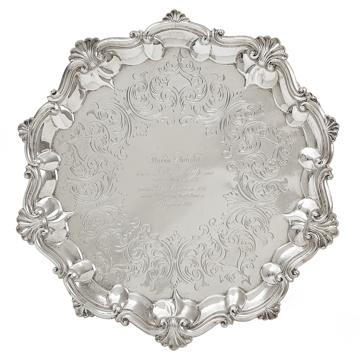 the shaped circular tray with scrollwork engraving surrounding a central reserve bearing the inscription 'flying Shingler/ Won the Turf Club Cup and/ LADIES PURSE in 1842/ Won the Steeple Chase in 1844/ and the Subscription Steeple Chase at/ Brighton 1851', supported by three scroll feet, total weight 584 gms, 27cm diameter