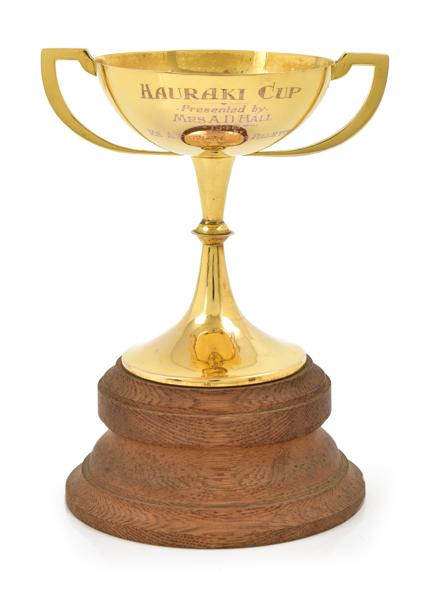 A GOLD 1946 HAURAKI CUP ON EBONISED STAND