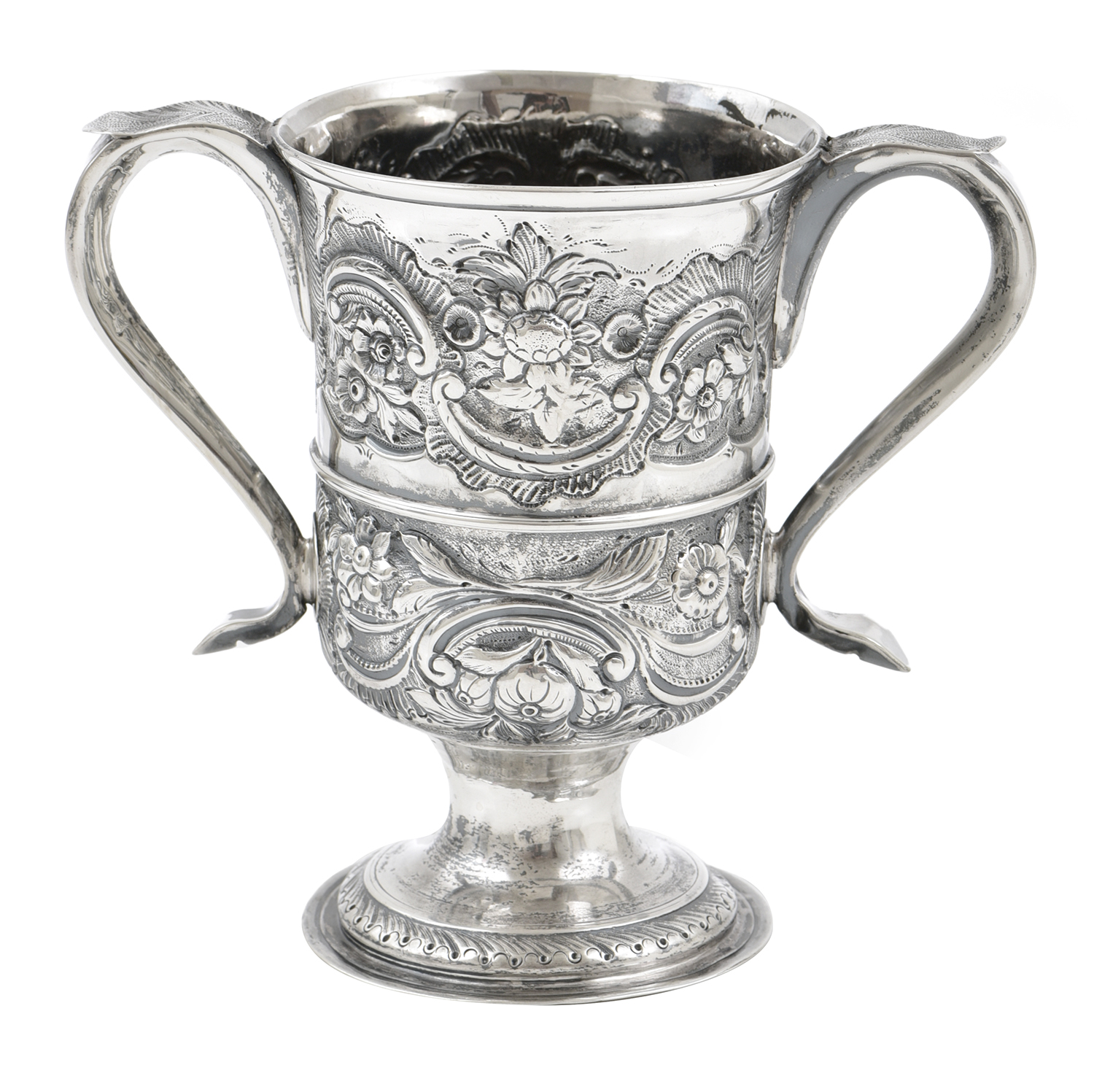the bell shaped cup with heavilly embossed decoration, moulded edge and girdle standing on a short pedestal foot and fitted with two leaf tip 'S' scroll handles terminating in a hoof foot, approximately 364 gms, 14 cm high
