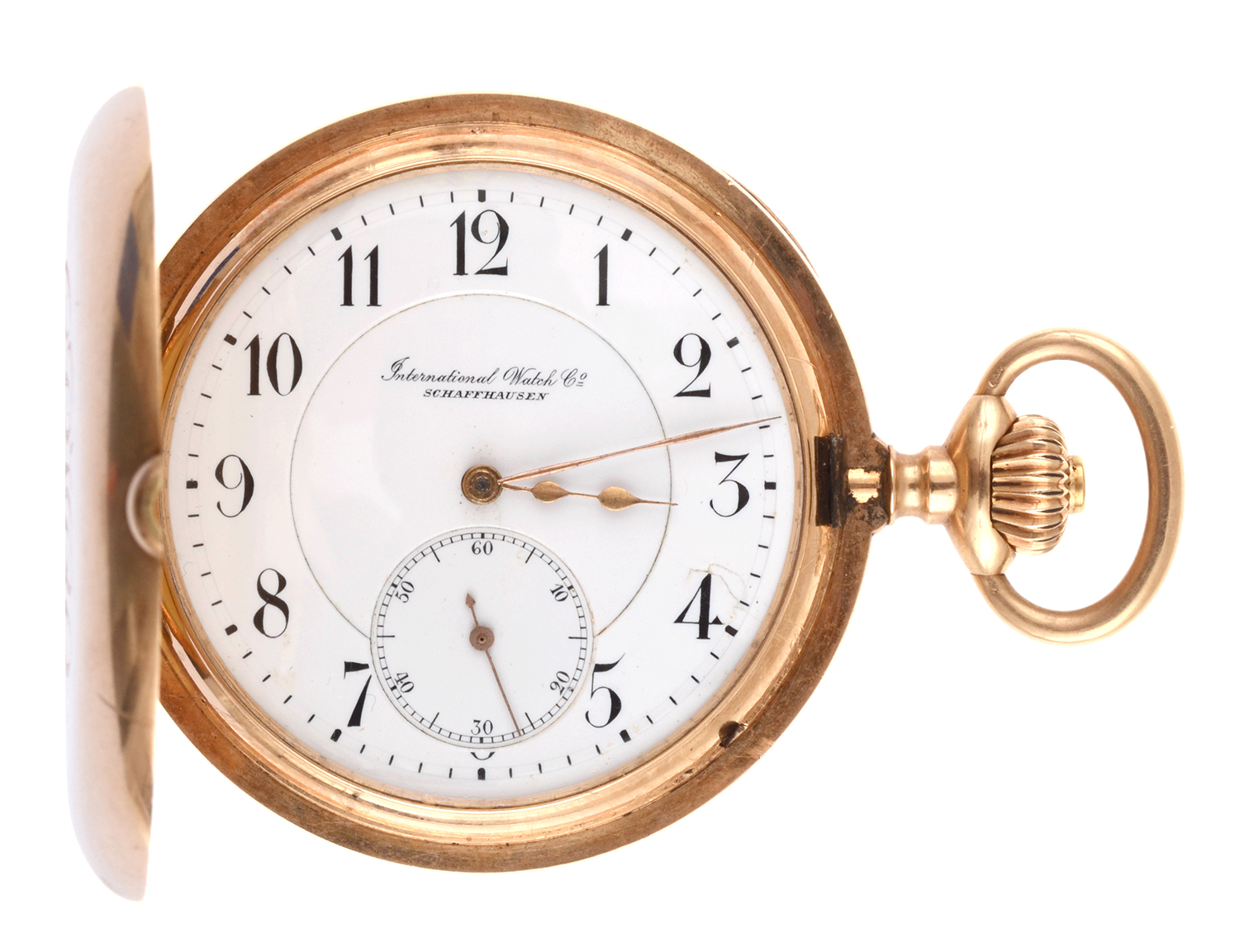 Crown wind and lever set movement, circular white enamel dial with Arabic numerals, subsidiary seconds dial at six, signed case, dial and movement, 14ct gold case with engraved monogram to lid, case reference 386921, movement number 361154, 54mm diameter.