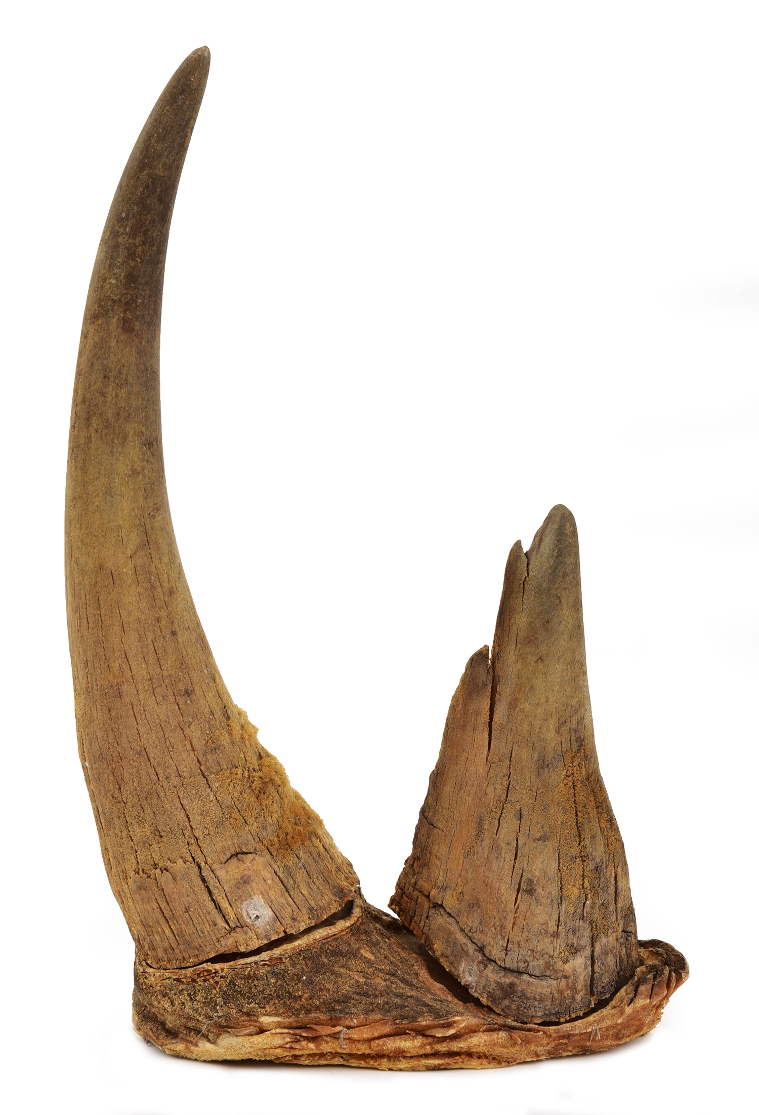 AN ANTERIOR AND POSTERIOR HORN FROM AN EASTERN BLACK RHINOCEROS, ON AN ORGANIC PRESENTATION BASE