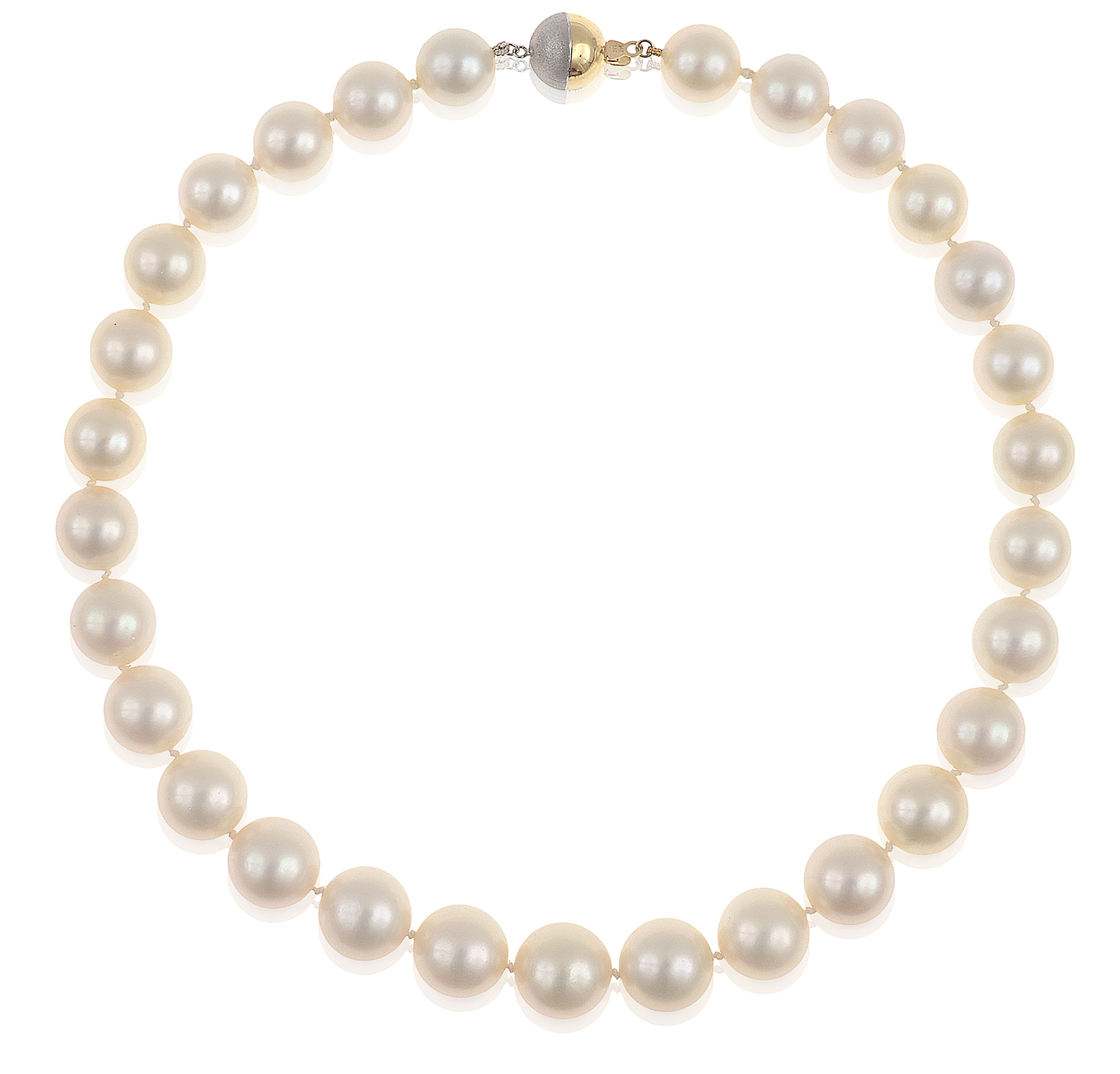The graduated strand of round pearls of cream and white hues measuring 12.3mm to 15.0mm, to a ball clasp in two tone 14ct gold, total length 450mm.