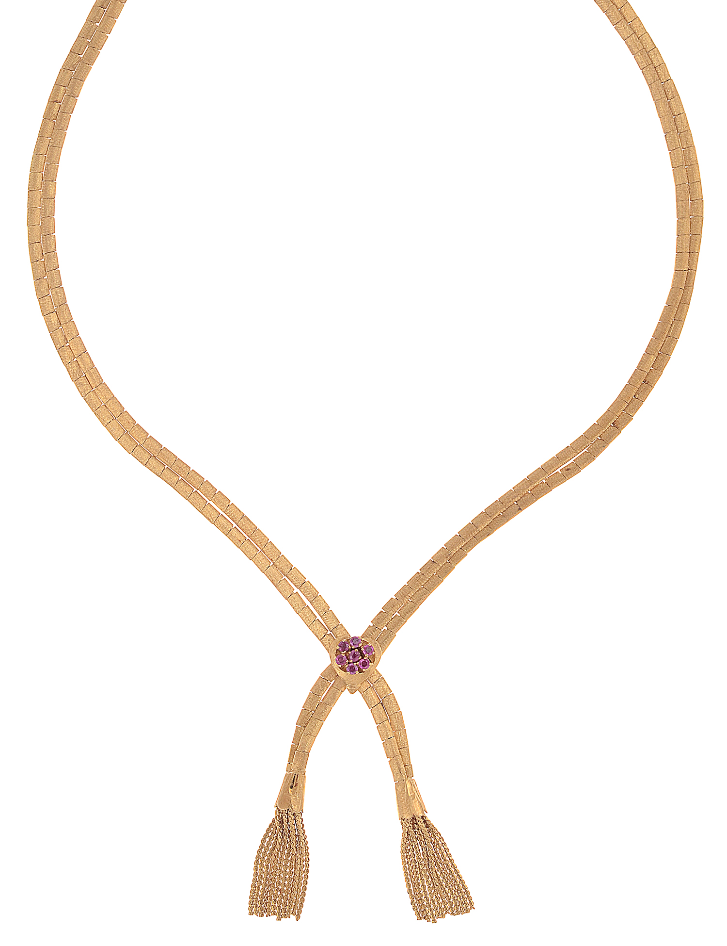 Featuring two gold strands with textured finish and tassel drops crossed over, centred by a cluster of round rubies, in 18ct gold, total length 400mm.