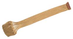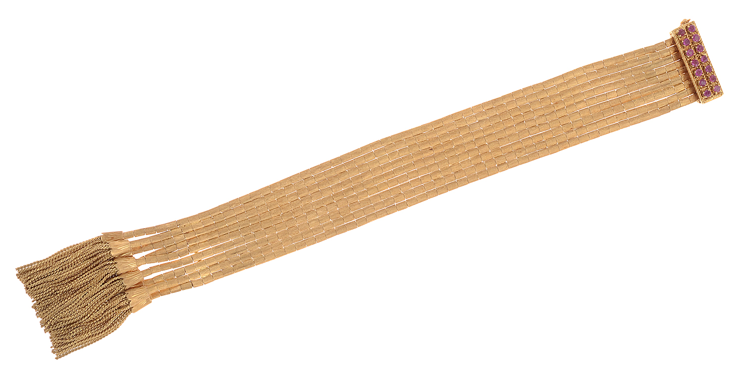 Comprising nine textured gold strands each finished with a tassel, overlaid with a rectangular ruby set clasp, in 18ct gold, total length 190mm.
