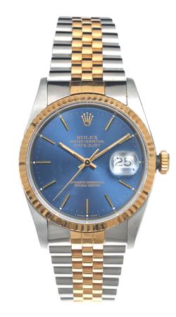 Automatic movement, circular blue dial with baton numerals, date aperture at three, signed case, dial and movement, stainless steel and gold case with conforming Jubilee bracelet bands, reference number 16200, serial number 16233, model number E211199, calibre 3135, 30mm diameter, with box.