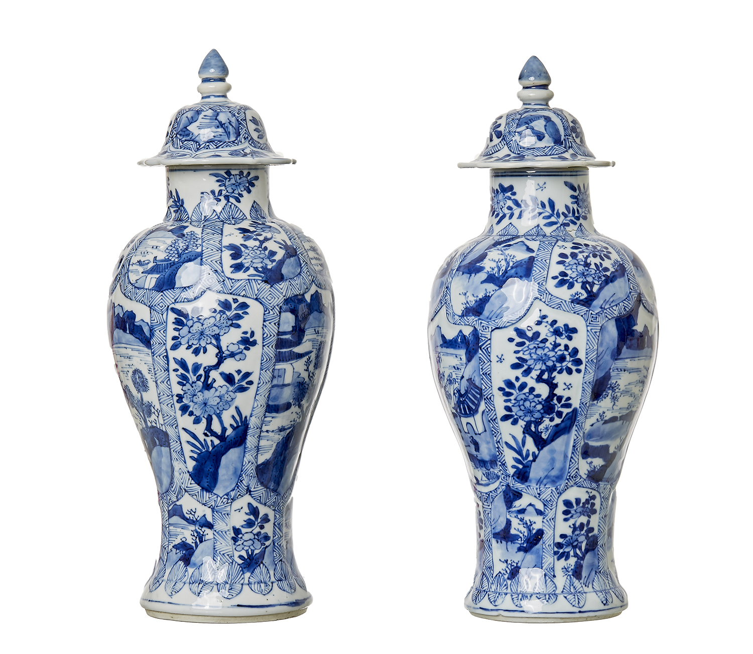 Of baluster form with raised windows featuring landscape scenes, 30.5cm high