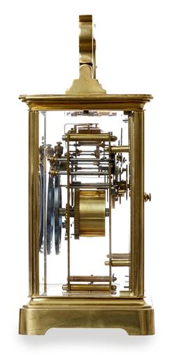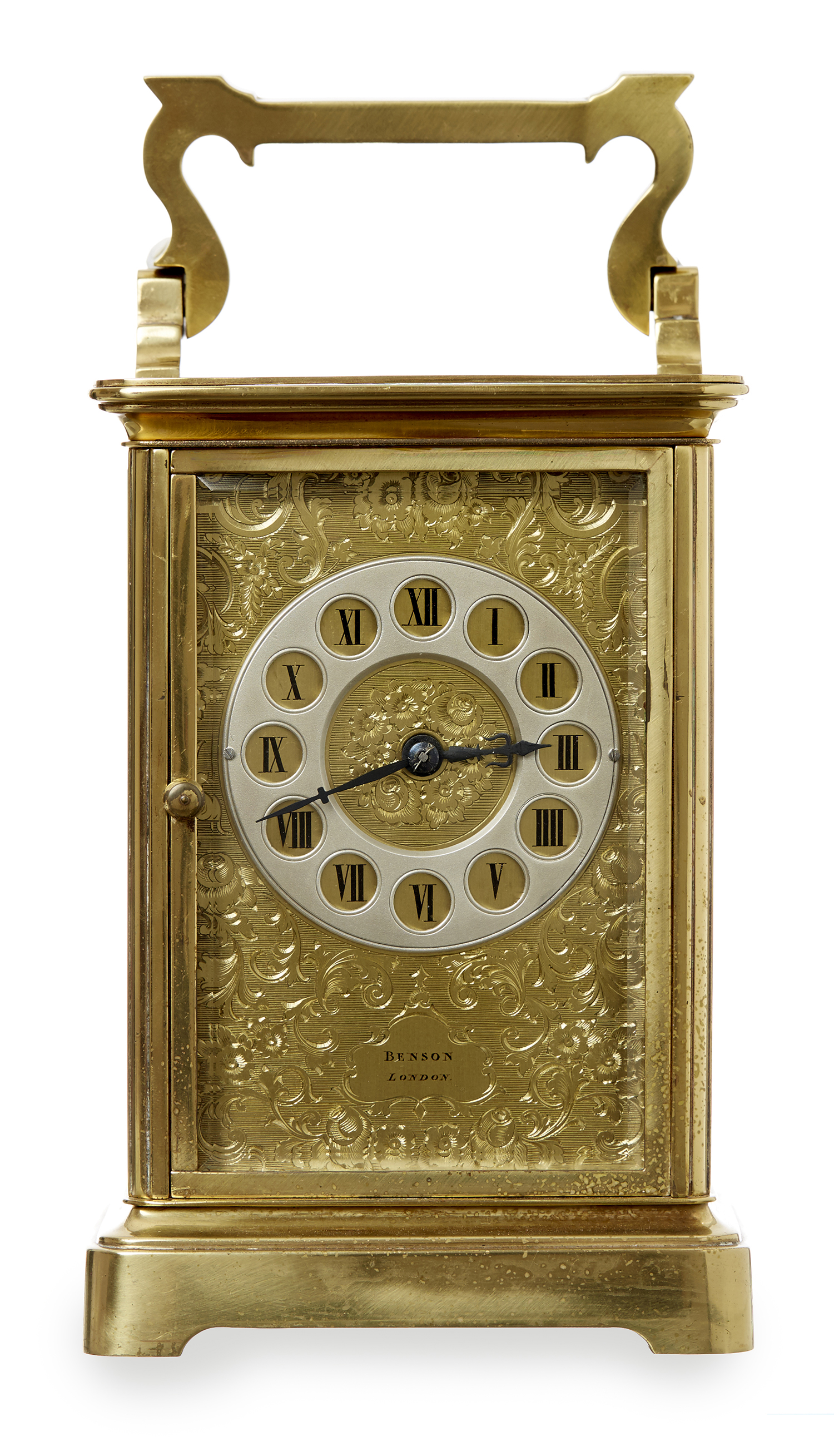 With scroll engraved plate, silver gilt dial with Roman numerals, cartouche marked Benson London, 26cm high with handle up