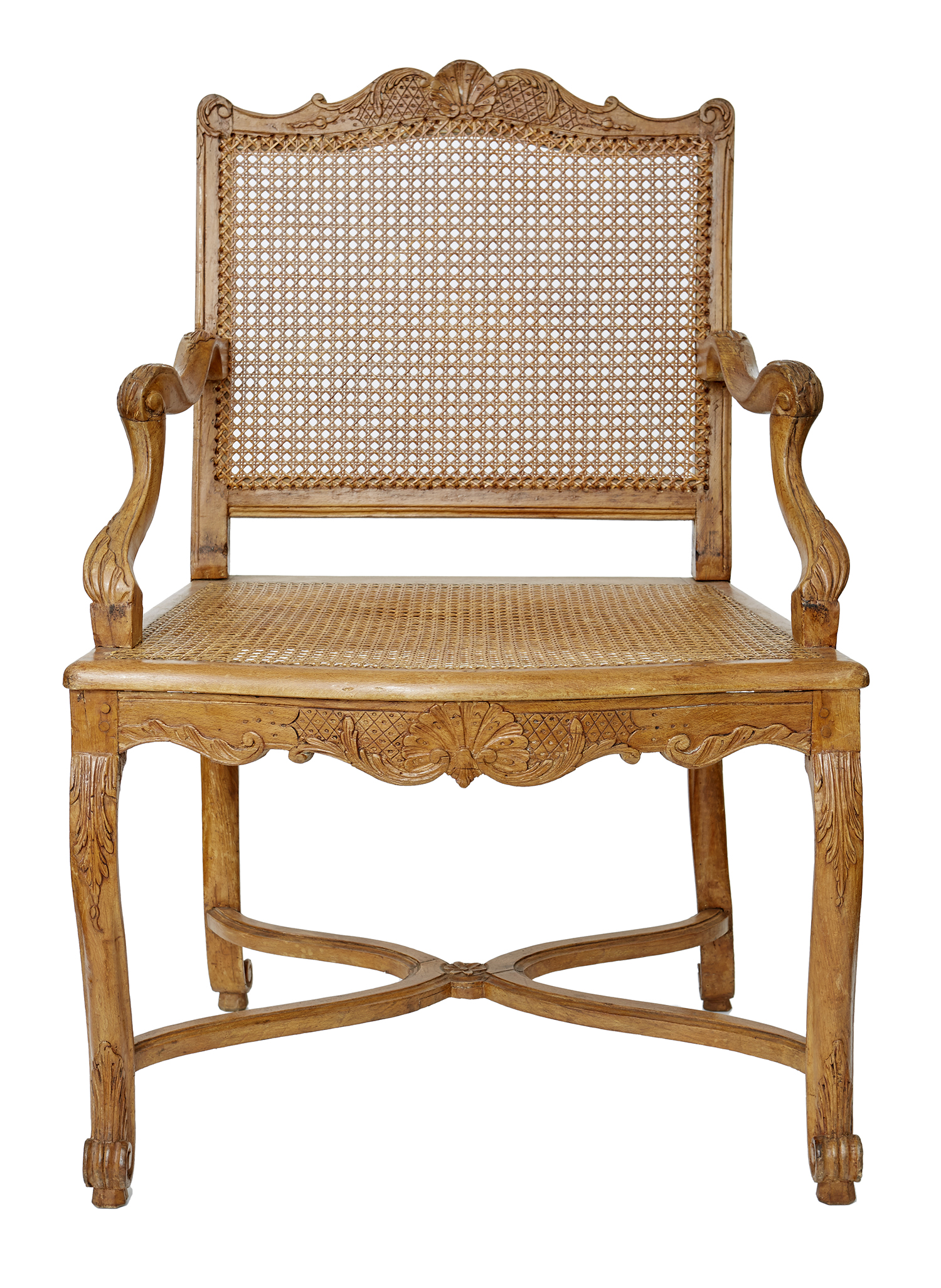 With carved crest and scroll moulded arms and feet and X framed stretcher