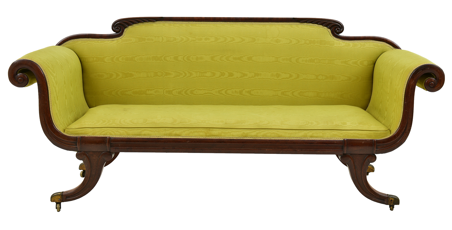 the shaped, feather carved back flanked by roll over arms and a fluted seat rail, sabre legs, brass caps and castors length of back , 213cm wide