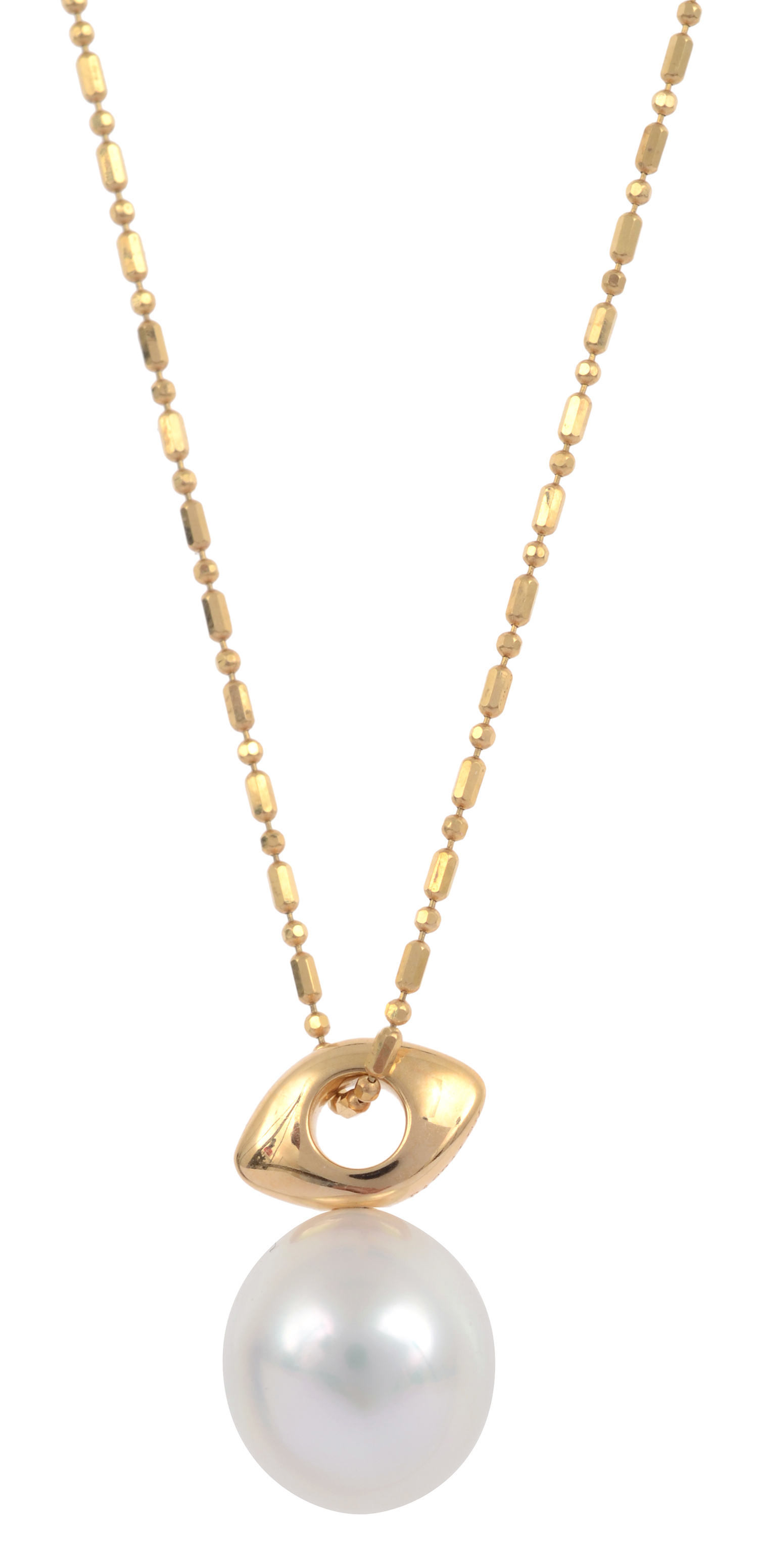The oval silver and white pearl measuring 12.05mm x 13.20mm, surmounted by a pierced geometric panel and suspended from a fancy link chain with diamond detail, all in 18ct gold, total length 420mm.