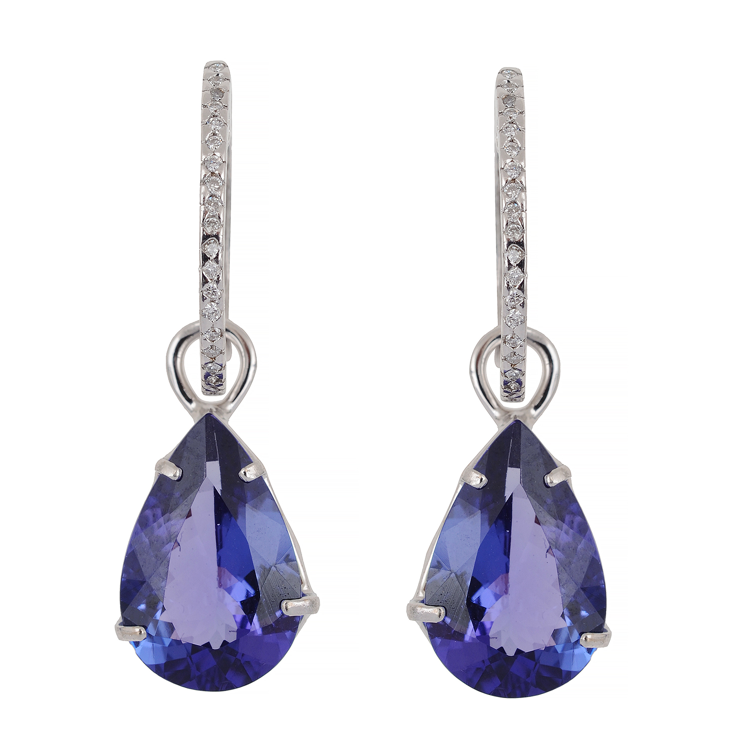 Each earring set with a pear cut tanzanite of 4.70cts surmounted by a detachable diamond set hoop, mounted in 18ct white gold.