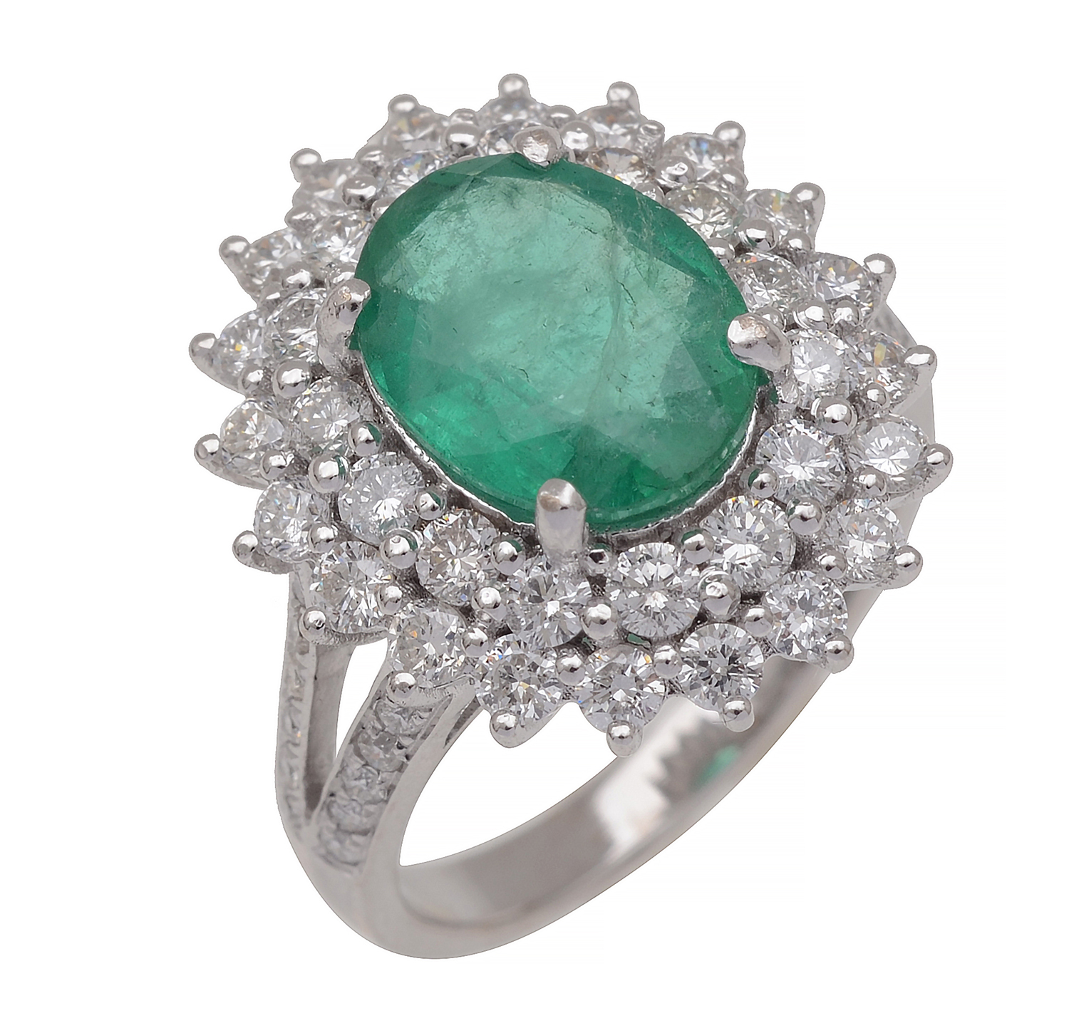 The oval cut emerald of 2.15cts surrounded by round brilliant cut diamonds totalling 1.20cts, mounted in 18ct white gold, ring size J.