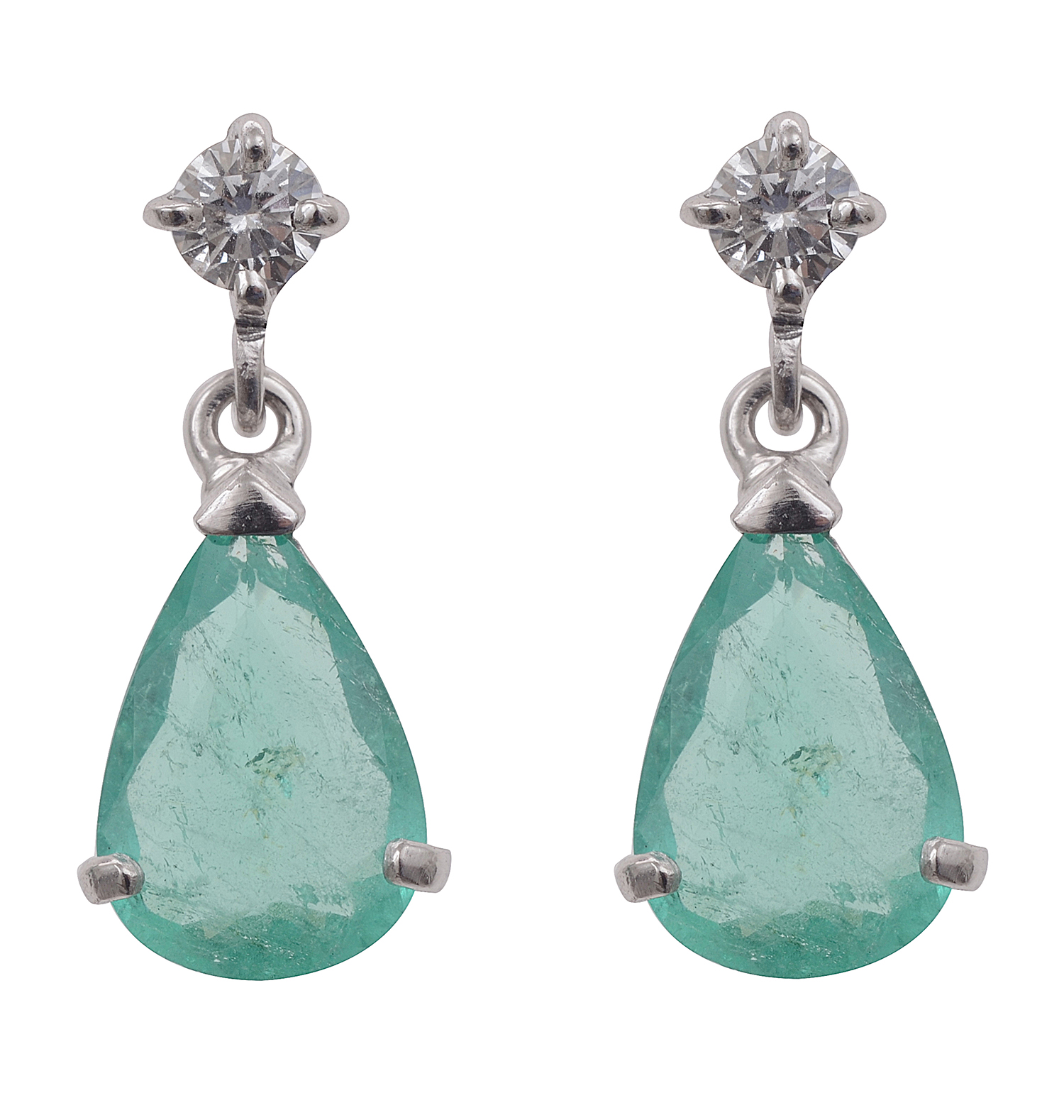 Each earring set with a pear cut emerald of 1.80cts surmounted by a round brilliant cut diamond, mounted in 18ct white gold.