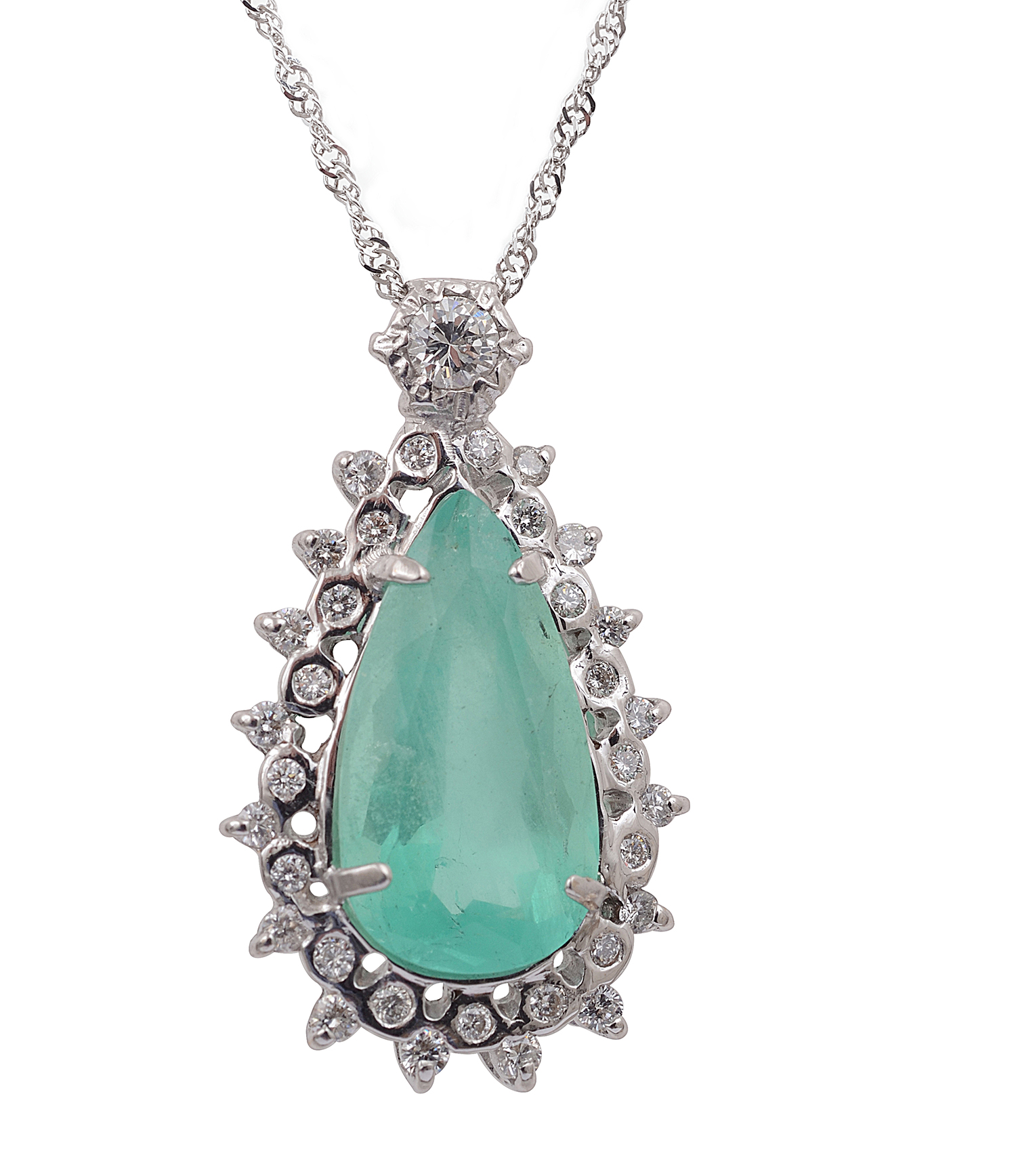 The pear cut emerald of 6.00cts, surrounded by round brilliant cut diamonds, suspended from a trace chain, all in 18ct white gold.