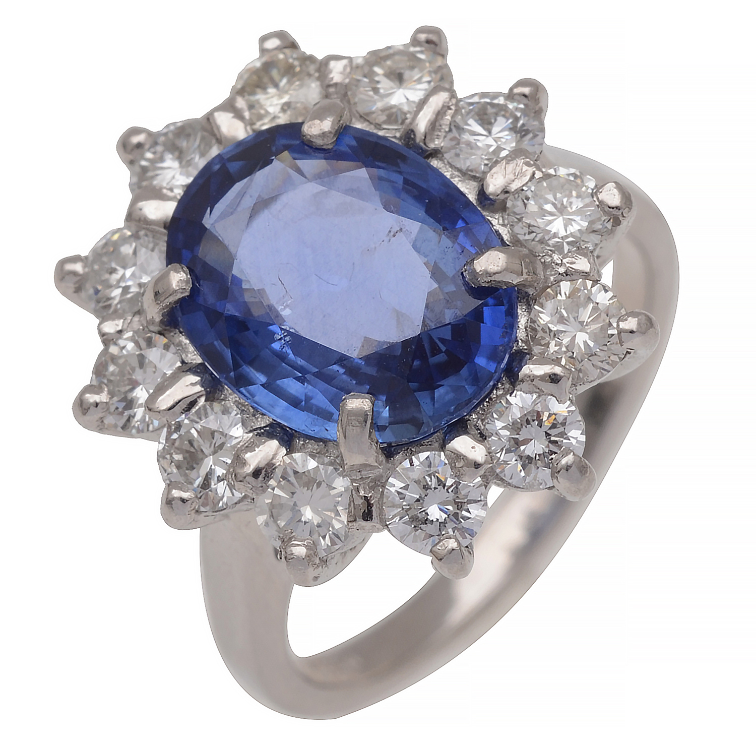 The oval cut sapphire of 4.00cts surrounded by twelve round brilliant cut diamonds totalling 1.40cts, mounted in platinum, ring size L.
