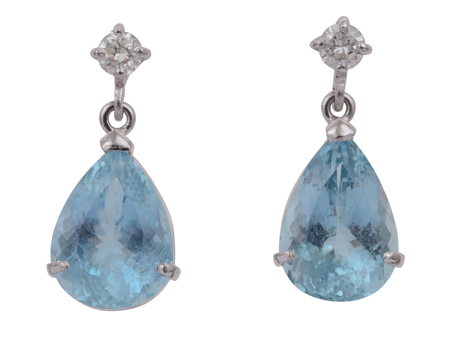 Each earring featuring a pear cut aquamarine of 3.60cts surmounted by a round brilliant cut diamond, mounted in 18ct white gold.