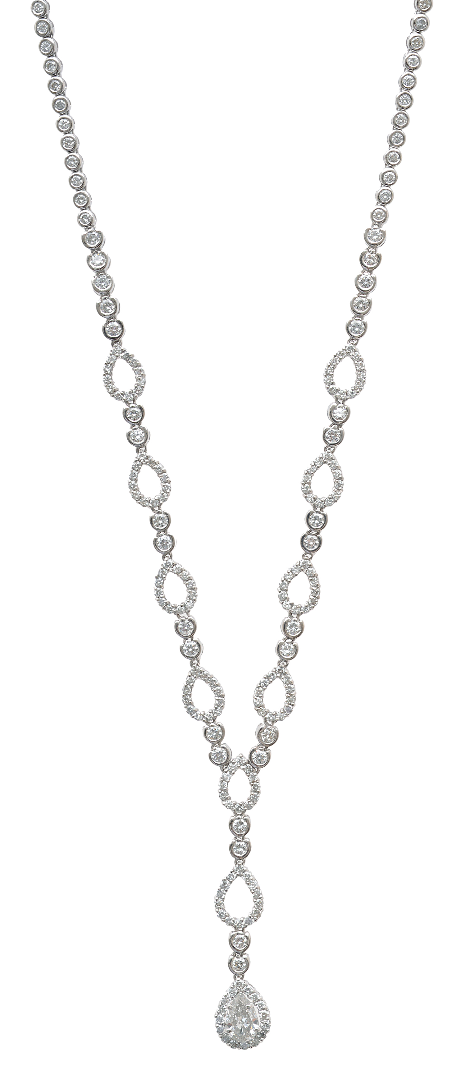 Featuring a central drop with a pear cut diamond of 0.62cts, surrounded and surmounted by round brilliant cut diamonds totalling 4.90cts, mounted in 18ct white gold, total length 420mm.