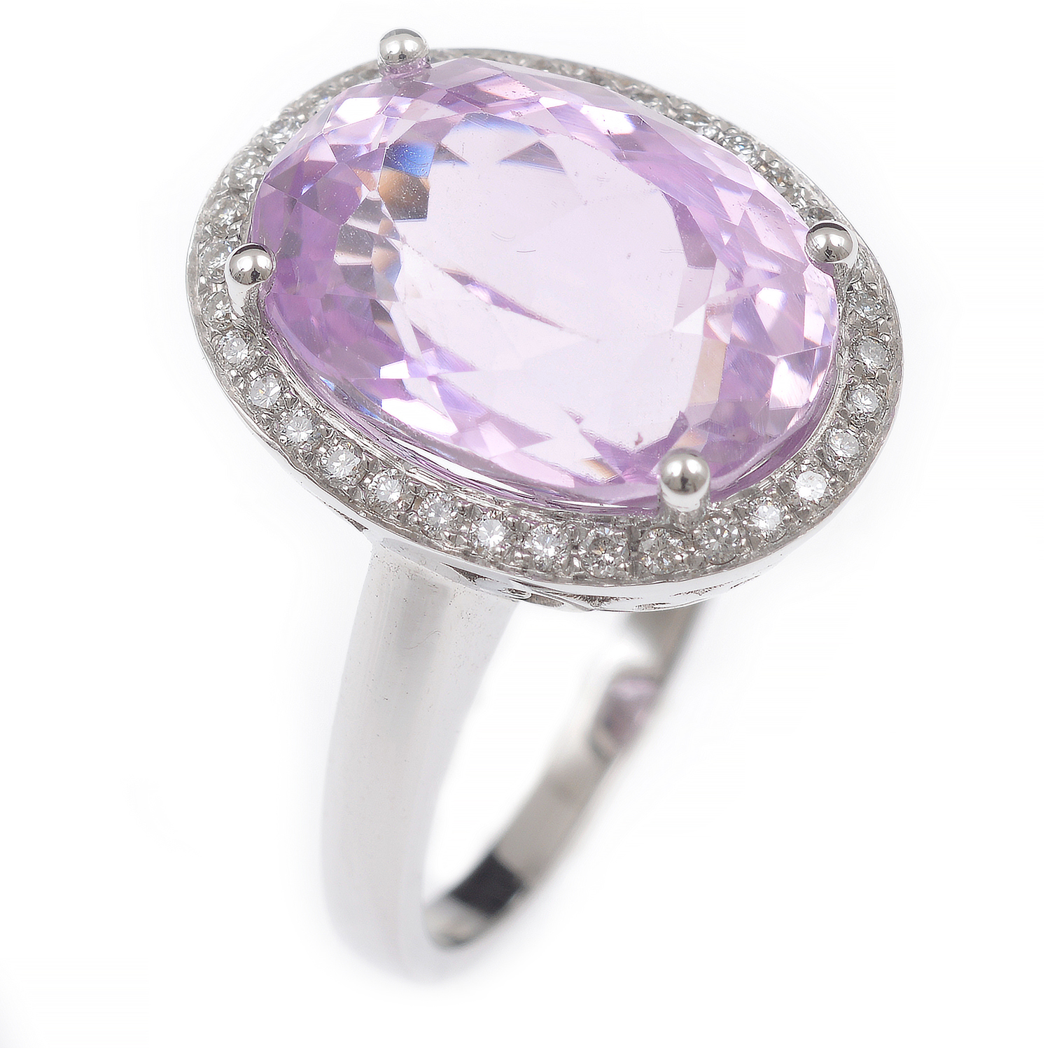 The oval cut kunzite of 9.10cts surrounded by round brilliant cut diamonds, mounted in 18ct white gold, ring size N.