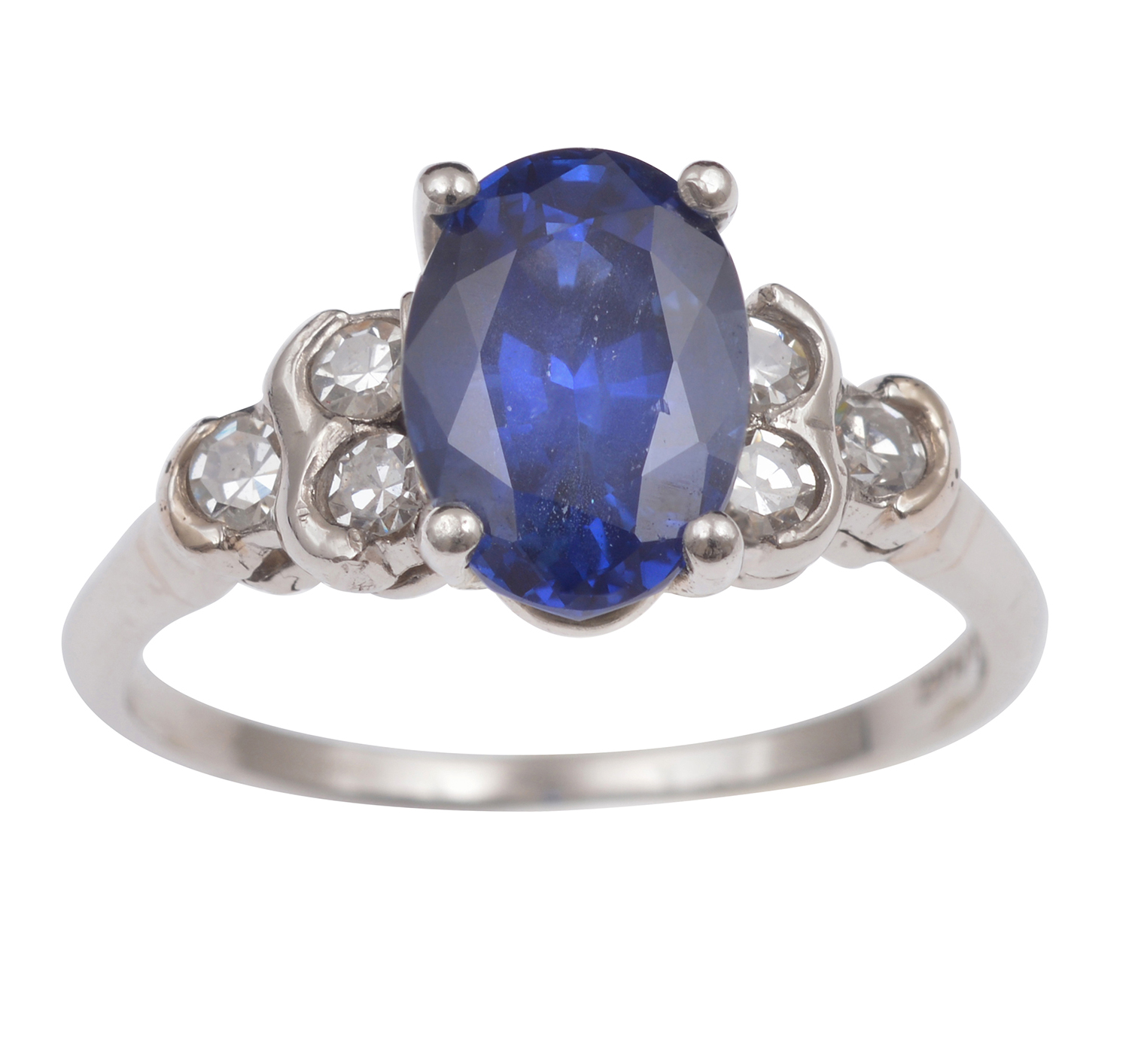 The oval cut sapphire of 2.24cts, accompanied by a GIA report stating sapphire shows no indications of heat treatment, flanked by a trefoil of diamonds to each shoulder, mounted in iridium and platinum, ring size L.