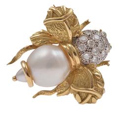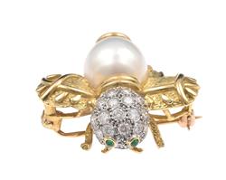 Styled as a bee, the head set with round brilliant cut diamonds and emeralds for eyes, the body formed with a baroque South Sea pearl, mounted in 18ct gold.