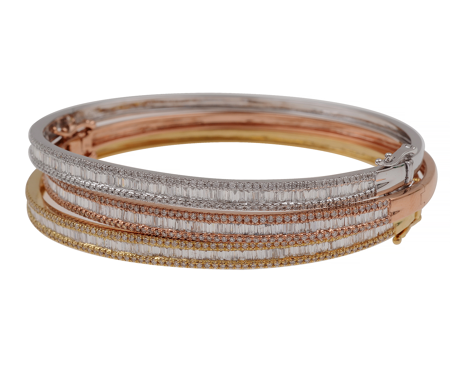 Each bangle having a central row of baguette cut diamonds, bordered by round brilliant cut diamonds, mounted in 18ct yellow, white or rose gold.