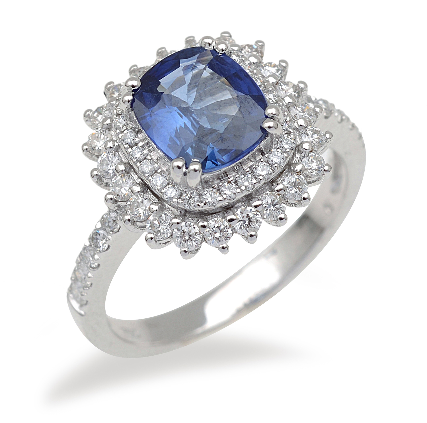 The cushion cut sapphire of 1.38cts surrounded by round brilliant cut diamonds totalling 0.53cts, mounted in 18ct white gold, ring size K.