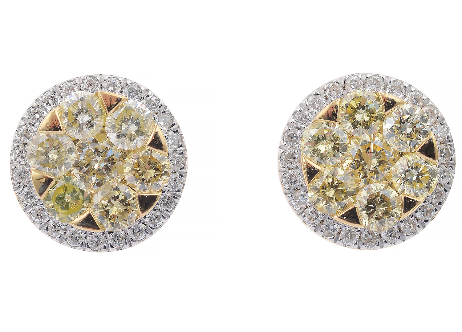 Each set with a cluster of seven round brilliant cut yellow diamonds totalling 0.80cts and encircled by a band of white diamonds, mounted in 18ct gold.