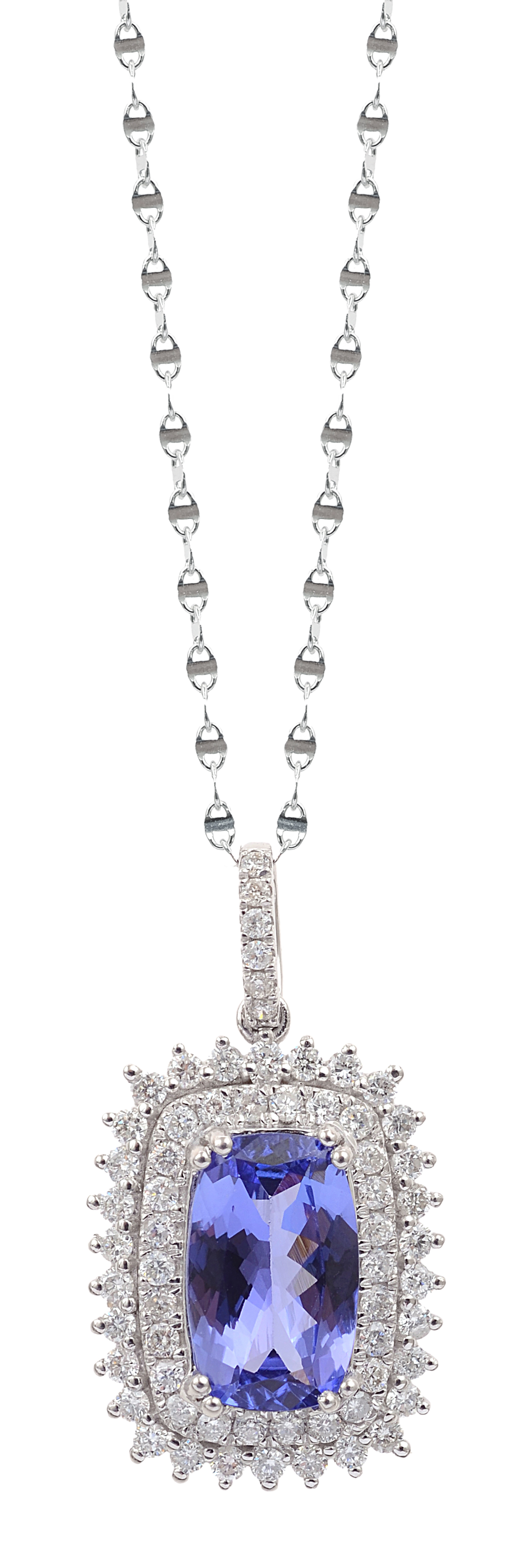 The cushion cut tanzanite of 2.46cts, surrounded by a double row of round brilliant cut diamonds and diamond set bale, suspended from a trace chain, all in 18ct white gold, total length 460mm.