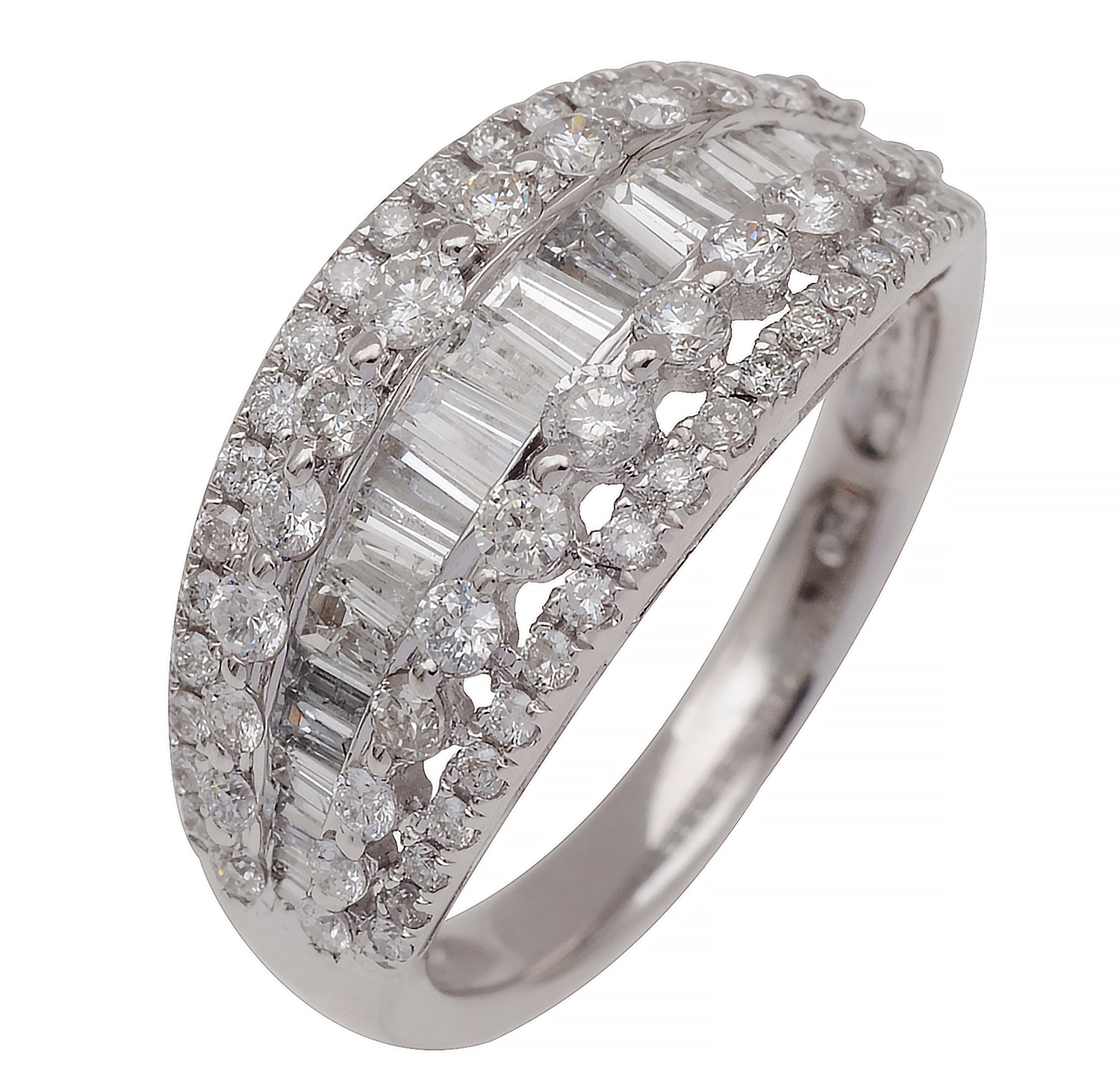 Featuring a central row of tapered baguette cut diamonds offset with rows of round brilliant cut diamonds all totalling 1.50cts, mounted in 18ct white gold, ring size M.