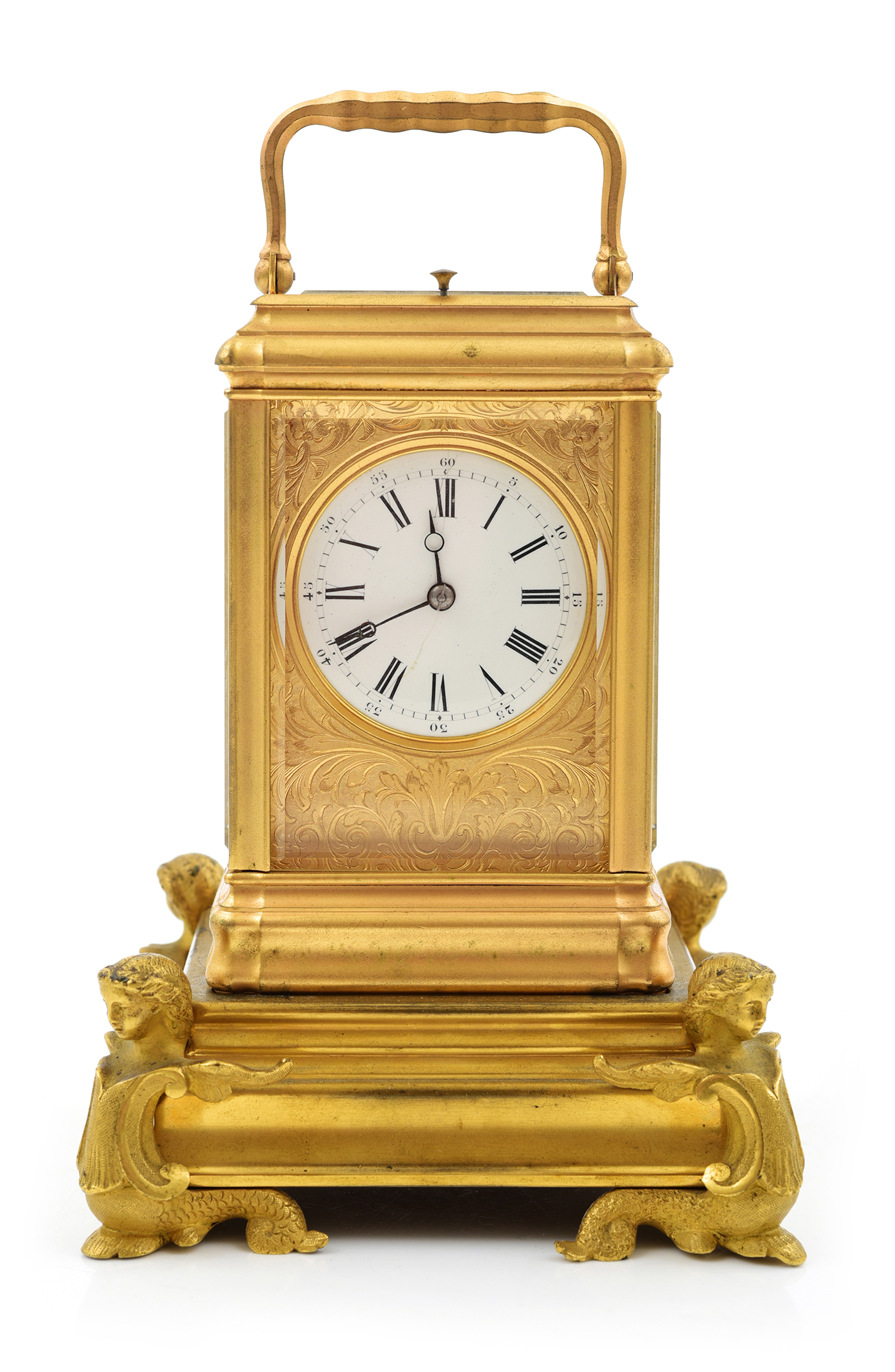 Wear to the gilt brass body and stand in places, but generally good; chip to the top left hand corner of the glass in the back door