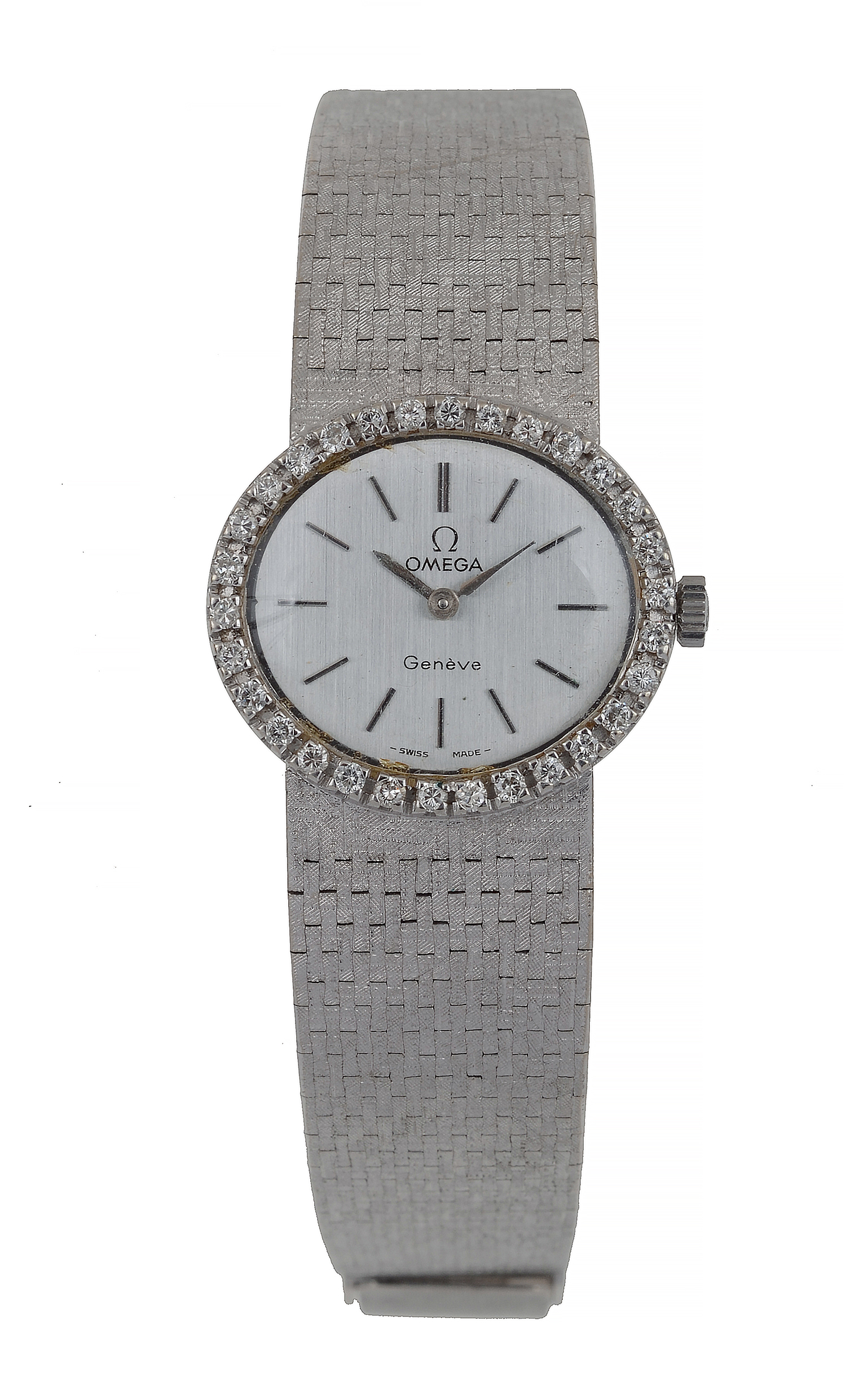 Manual wind movement, oval silvered dial with baton numerals, signed case, dial and movement, 18ct white gold case with diamond set bezel and bracelet bands, total length 155mm, 20mm diameter.