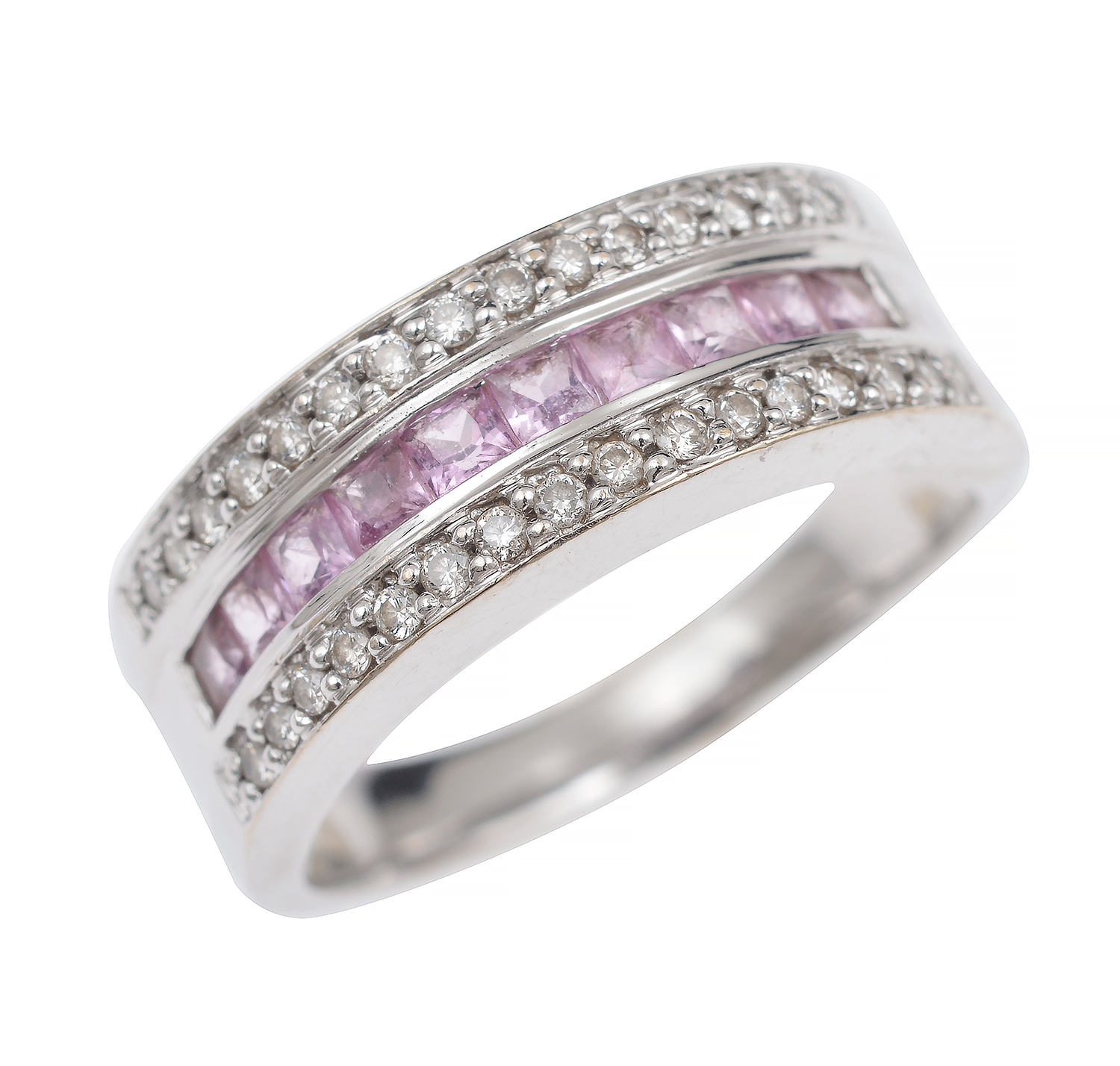 Featuring a central row of carre cut pink sapphires, flanked by rows of round brilliant cut diamonds, in 18ct white gold, ring size O.