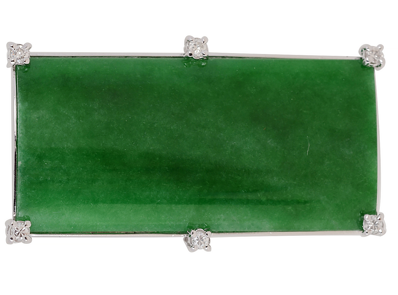 The rectangular panel opaque green jadeite cut en cabochon, offset by six round brilliant cut diamonds, mounted in 18ct white gold.