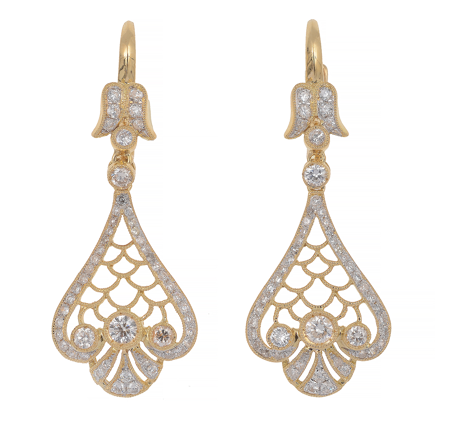Each earring of pierced fan design grain set with round brilliant cut diamonds totalling 1.25cts, mounted in 18ct gold.